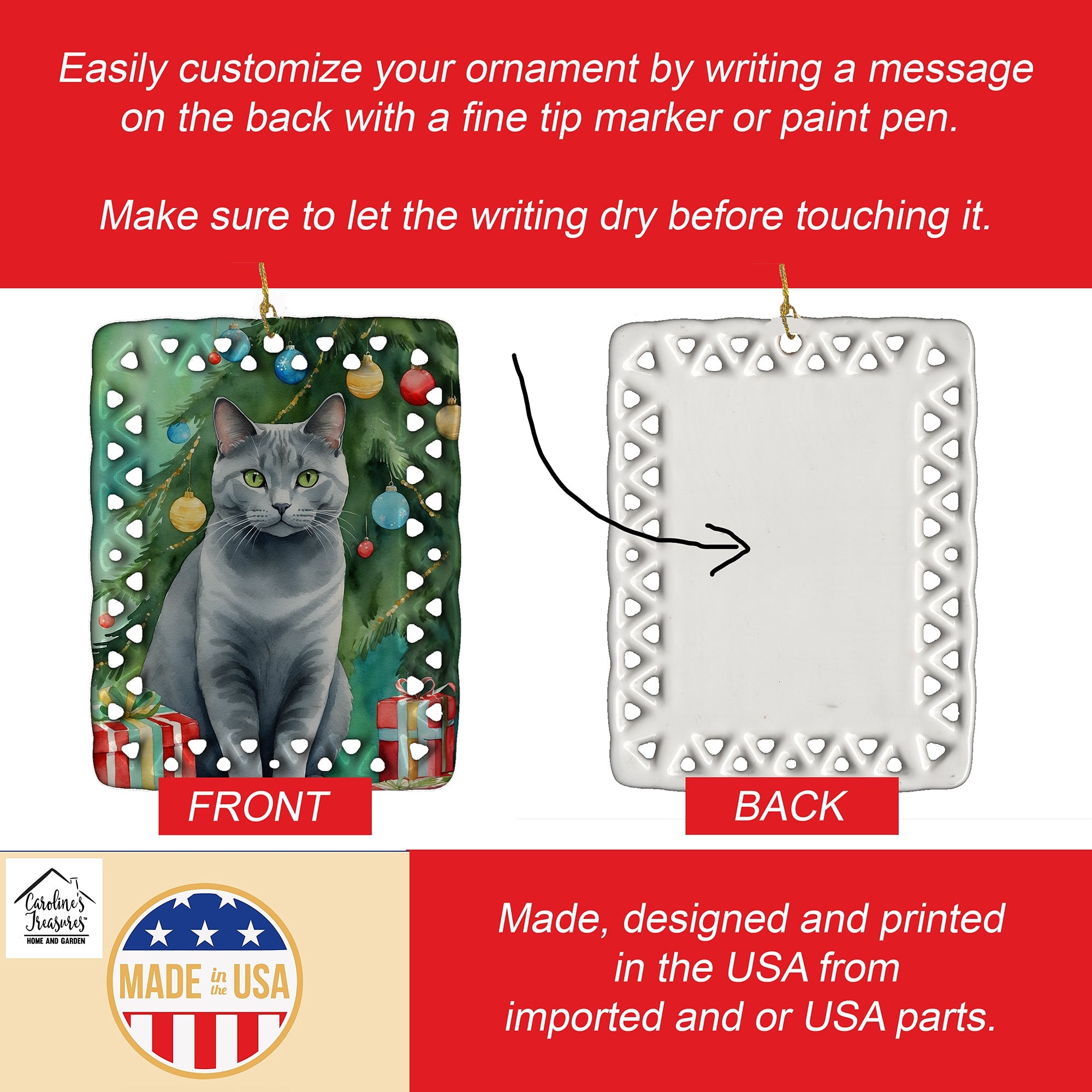 Porcelain Ornament featuring breed specific Chartreux artwork. Celebrate Christmas with this Christmas Ornament. Add a unique, personal touch to your holiday decor with our Rectangular Lattice Porcelain Ornament. Perfect for creating cherished memories, this high-quality ornament shines under festive lights, reflecting warmth and joy throughout your Christmas tree. Crafted with a glossy finish, it showcases vibrant, full-color artwork contributed by our talented artists, ensuring your tree is adorned with a burst of color and holiday spirit. What sets this Porcelain Ornament apart is its customizable white back. Use a paint pen or permanent marker to write a heartfelt message, commemorate a special year, or mark an unforgettable date, turning this ornament into a keepsake that will be treasured for years to come. For best results, allow any personalization to dry thoroughly before handling. Each ornament comes complete with a delicate gold cord, making it easy to hang and display. Proudly made in the USA, this ornament measures 3.375 x 2.625 inches and is a thoughtful gift for pet sitters, teachers, family members, or anyone who would appreciate a little extra holiday magic. Bring style, charm, and a touch of personal meaning to your Christmas tree with this beautifully designed ornament..