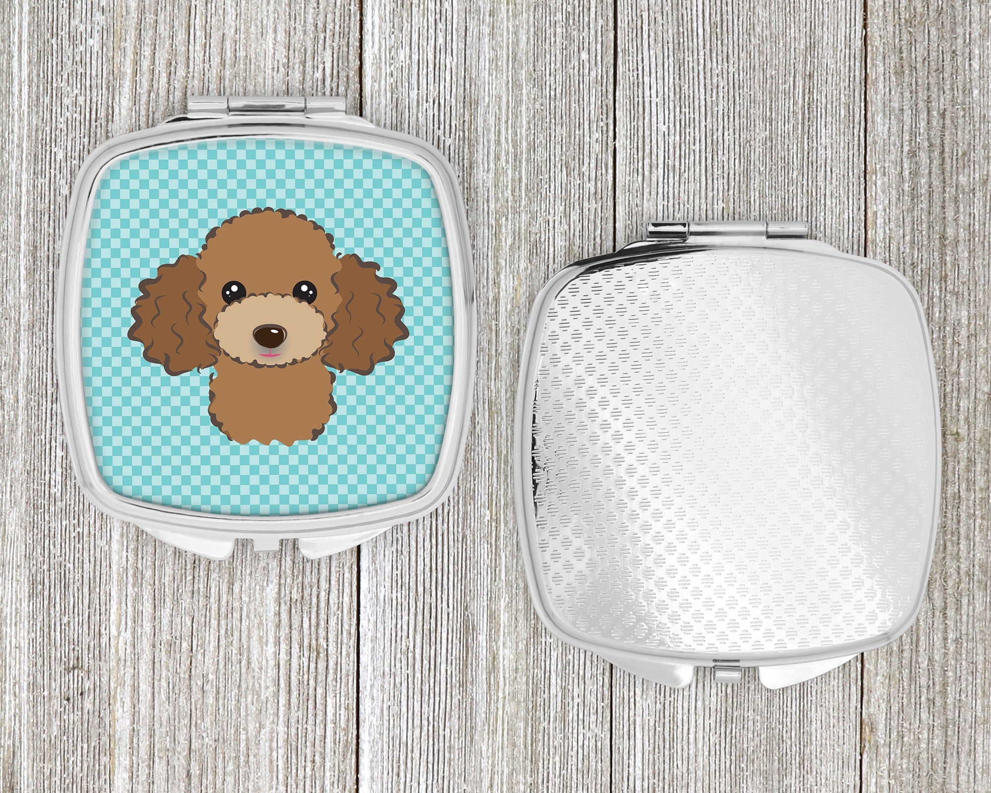 Decorate your space with our Poodle artwork on a Compact Mirror. Introducing our Square Compact Mirror, a blend of elegance, functionality, and compactness, perfect for on-the-go touch-ups. This Silvertone metal mirror, with dimensions of 2.75 inches x 3 inches x .3 inches, fits effortlessly into your purse, handbag, or pocket, ensuring that you can check your appearance anytime, anywhere. Our compact mirror stands out with its eye-catching artwork on the front, adding a dash of style to this practical accessory. It is more than just a mirror; it's a statement piece that reflects your personality and aesthetic. When opened, this compact reveals two mirrors inside, doubling your perspective for precise touch-ups. The Silvertone metal construction ensures durability while maintaining a lightweight feel, making it an ideal everyday carry item. Whether you're rushing to a meeting, prepping for a dinner date, or just need a quick check on your look, our Square Compact Mirror is your reliable companion. Experience the perfect blend of style and practicality with this must-have accessory.