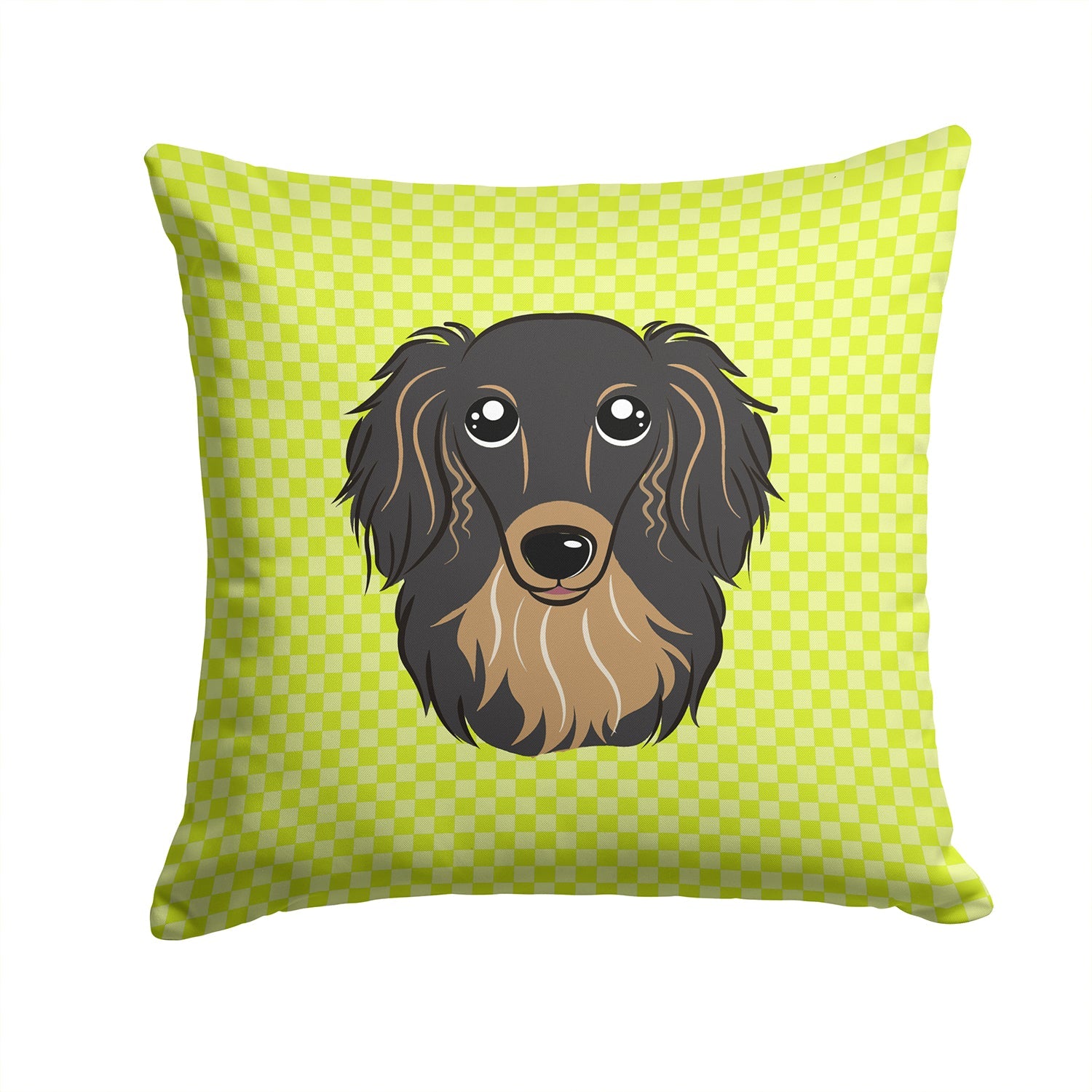 Checkerboard Lime Green Longhair Black and Tan Dachshund Canvas Throw Pillow - 14x14 Decorative Pillow – Art for Your Home & Patio BB1275PW1414