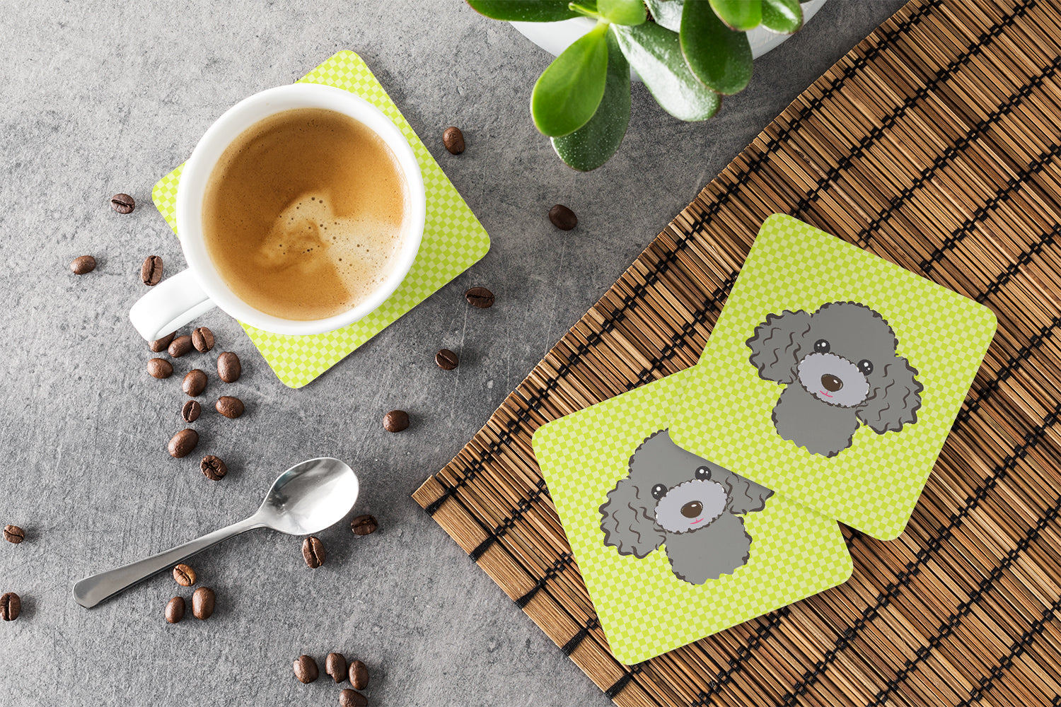 Decorate your space with our Poodle artwork on a Coaster set. Presenting our Set of 4 Foam Coasters, a stylish and practical addition to your table setting. Each square coaster, measuring 3 1/2 inches by 3 1/2 inches, is perfectly sized to accommodate various drinkware, from coffee mugs to tumblers. These coasters stand out with their full-color artwork, permanently dyed onto the material for a vibrant and fade-resistant finish. They're not just functional, they're a fashionable statement, adding a touch of flair to any gathering or event. Our foam coasters serve a dual purpose - they protect your table from water stains and are perfect for both hot and cold drinks. The material used is similar to that of our high-quality mouse pads, ensuring durability and heat resistance. These coasters are easy to maintain - simply wash them in the top of your dishwasher and lay flat to dry. The design won't come off, ensuring they retain their vivid colors for years. Pair them with one of our insulated coolers or huggers for a cohesive, thoughtful gift set. Enhance your beverage experience with our Set of 4 Foam Coasters.