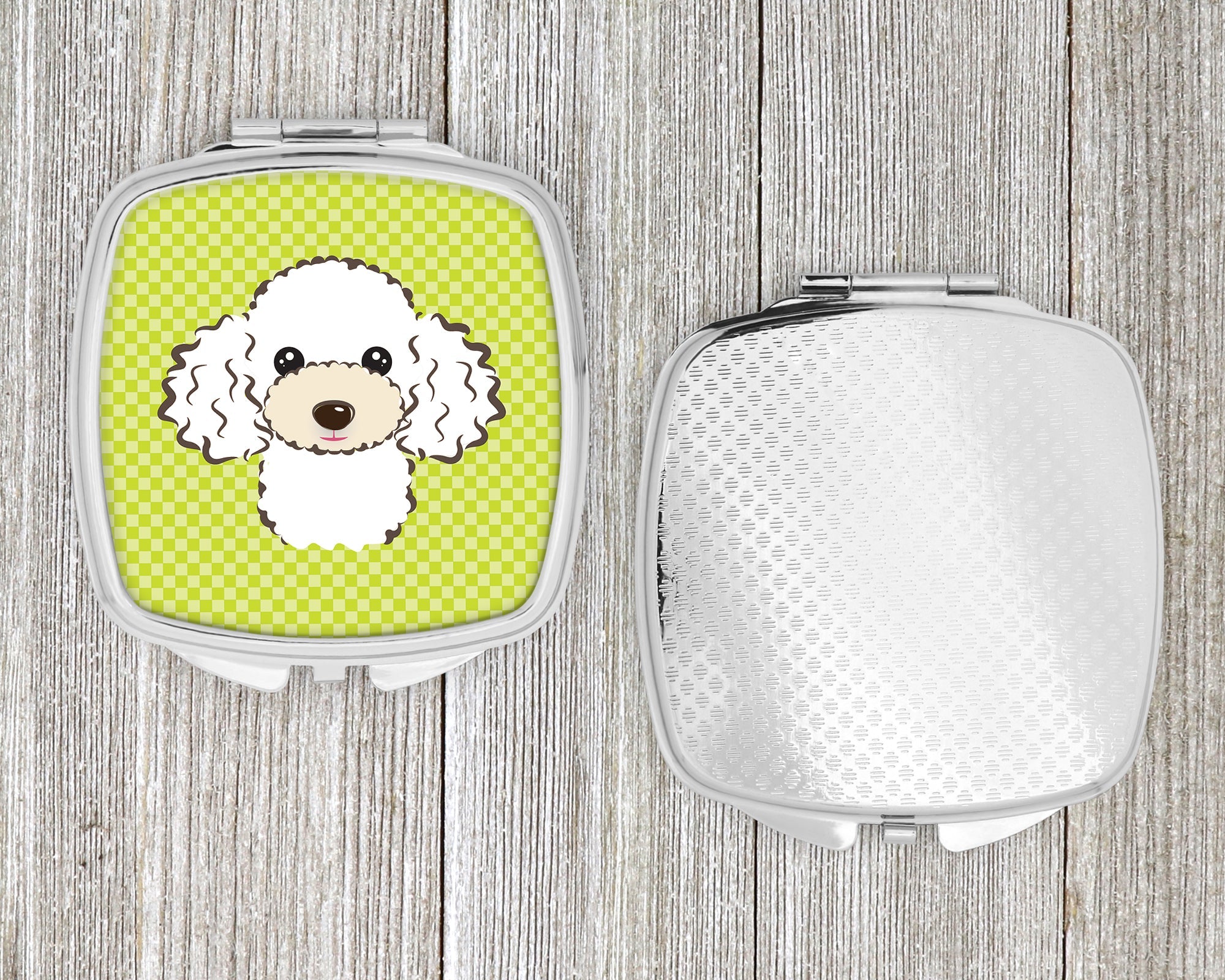 Decorate your space with our Poodle artwork on a Compact Mirror. Introducing our Square Compact Mirror, a blend of elegance, functionality, and compactness, perfect for on-the-go touch-ups. This Silvertone metal mirror, with dimensions of 2.75 inches x 3 inches x .3 inches, fits effortlessly into your purse, handbag, or pocket, ensuring that you can check your appearance anytime, anywhere. Our compact mirror stands out with its eye-catching artwork on the front, adding a dash of style to this practical accessory. It is more than just a mirror; it's a statement piece that reflects your personality and aesthetic. When opened, this compact reveals two mirrors inside, doubling your perspective for precise touch-ups. The Silvertone metal construction ensures durability while maintaining a lightweight feel, making it an ideal everyday carry item. Whether you're rushing to a meeting, prepping for a dinner date, or just need a quick check on your look, our Square Compact Mirror is your reliable companion. Experience the perfect blend of style and practicality with this must-have accessory.
