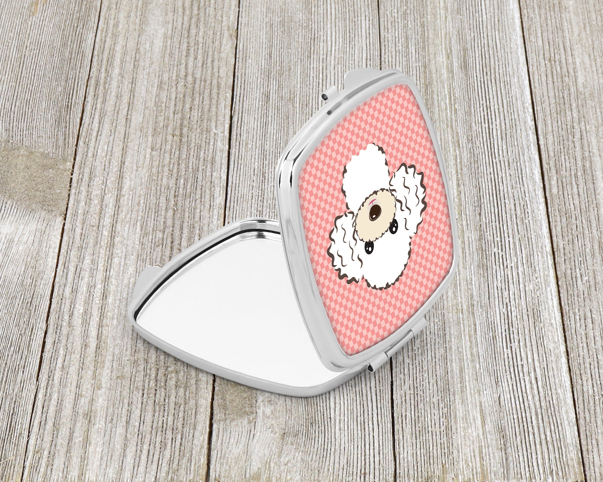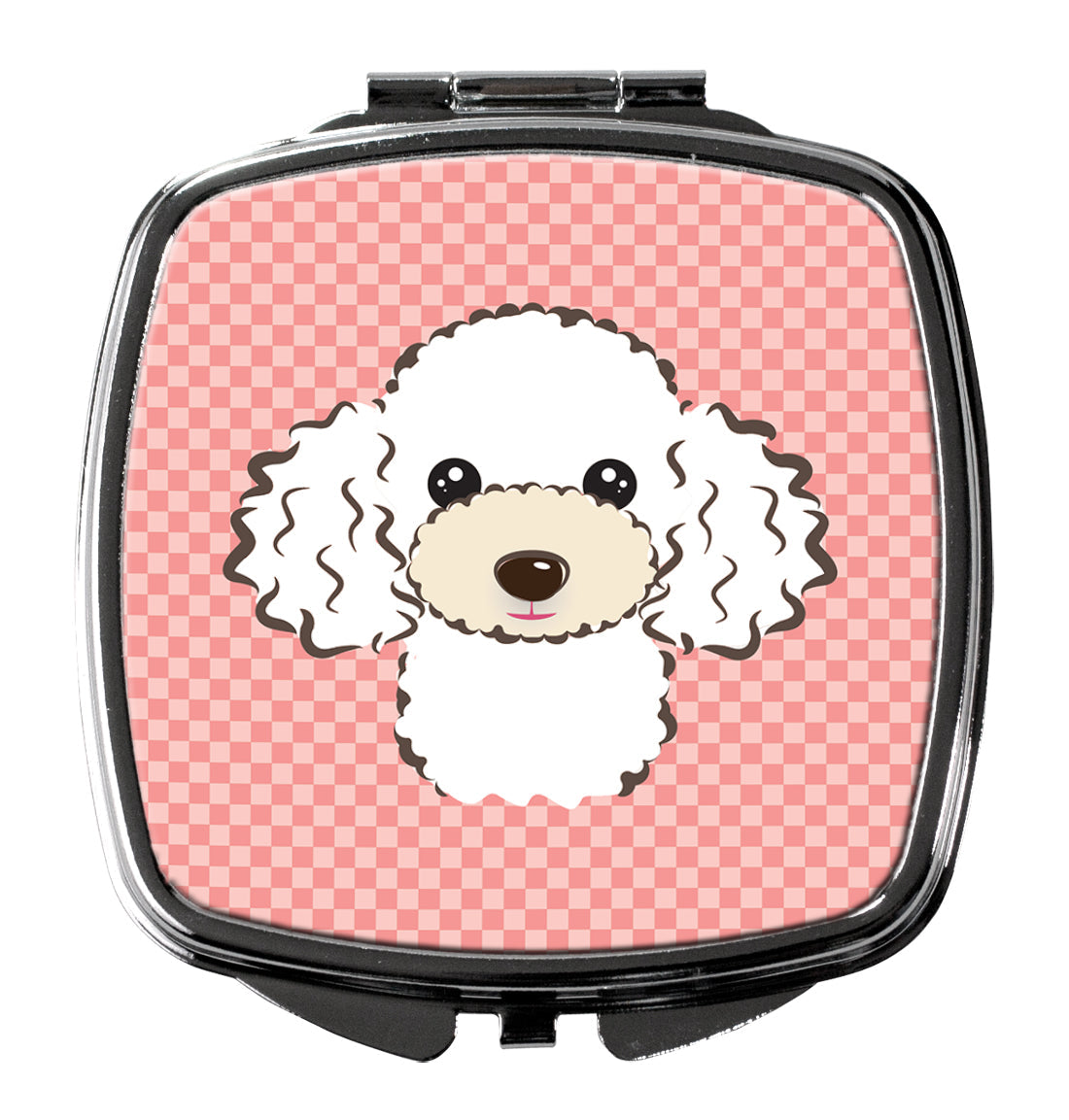 Decorate your space with our Poodle artwork on a Compact Mirror. Introducing our Square Compact Mirror, a blend of elegance, functionality, and compactness, perfect for on-the-go touch-ups. This Silvertone metal mirror, with dimensions of 2.75 inches x 3 inches x .3 inches, fits effortlessly into your purse, handbag, or pocket, ensuring that you can check your appearance anytime, anywhere. Our compact mirror stands out with its eye-catching artwork on the front, adding a dash of style to this practical accessory. It is more than just a mirror; it's a statement piece that reflects your personality and aesthetic. When opened, this compact reveals two mirrors inside, doubling your perspective for precise touch-ups. The Silvertone metal construction ensures durability while maintaining a lightweight feel, making it an ideal everyday carry item. Whether you're rushing to a meeting, prepping for a dinner date, or just need a quick check on your look, our Square Compact Mirror is your reliable companion. Experience the perfect blend of style and practicality with this must-have accessory.