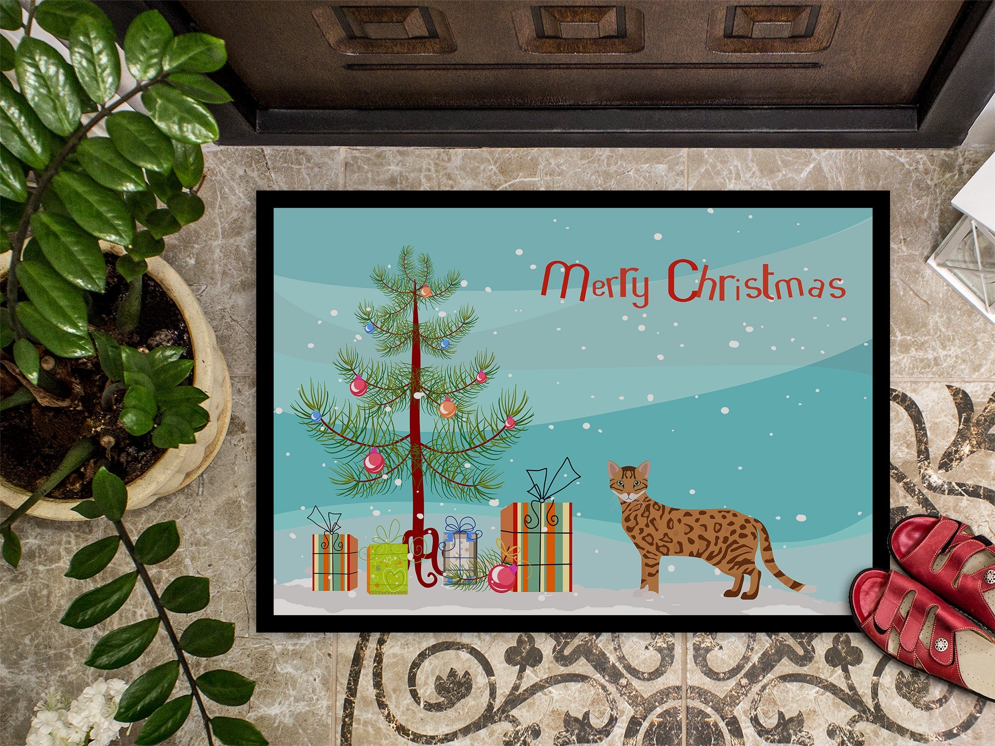 Decorate your space with our Christmas Cheetoh artwork on a Doormat. Welcome your guests in style with our Artwork Door Mat, designed to withstand almost any weather condition. This mat, measuring approximately 24 by 36 inches, is held together by durable black binding tape. Its top layer, composed of polyester felt, is dyed with the eye-catching image you see on the mat. A few layers below provide the mat with stability, while its rubber bottom is stamped to help prevent slipping and ensures safety. Our mat works wonderfully as both an indoor or outdoor door mat. For cleaning, simply hose it off with water or use a power washer - no need for any cleaner that produces suds. Avoid scrubbing with a brush, instead, opt for the vacuum on floor setting. Designed manufactured and printed in the USA, this mat is a perfect addition to your porch, outdoor kitchen, entryway, or any indoor space. Its unique design makes it a charming decorative rug that greets your guests and adds a stylish touch to your home decor.