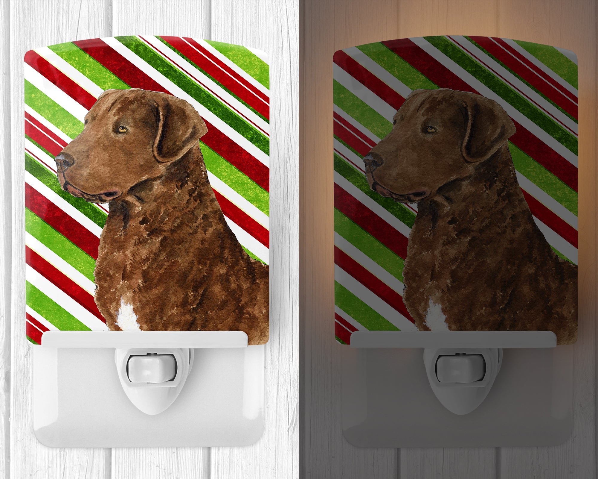 Decorate your space with our Christmas Chesapeake Bay Retriever artwork on a Night Light. Introduce a splash of artistic flair and subtle illumination to your space with the Decorative Ceramic Night Light from Caroline's Treasures. Perfect for any room, this night light seamlessly blends functionality with an aesthetic appeal, offering a stylish solution to brighten up dark corners of your home or office. Boasting a six-inch high by four-inch wide ceramic tile at the front, it showcases vivid, full-color artwork from distinguished artists, transforming a simple utility into a vibrant art piece. The artwork is securely encased in a robust metal holder, ensuring durability and longevity. Two screws are provided to firmly affix the tile into the holder. The holder extends three inches deep, housing an included bulb that emits a soft, welcoming glow. This product meets all safety standards, as evidenced by its UL approval. Proudly made in the United States from imported components, this Decorative Ceramic Night Light is not just a functional device; it's a statement piece that enhances the ambiance of your surroundings.