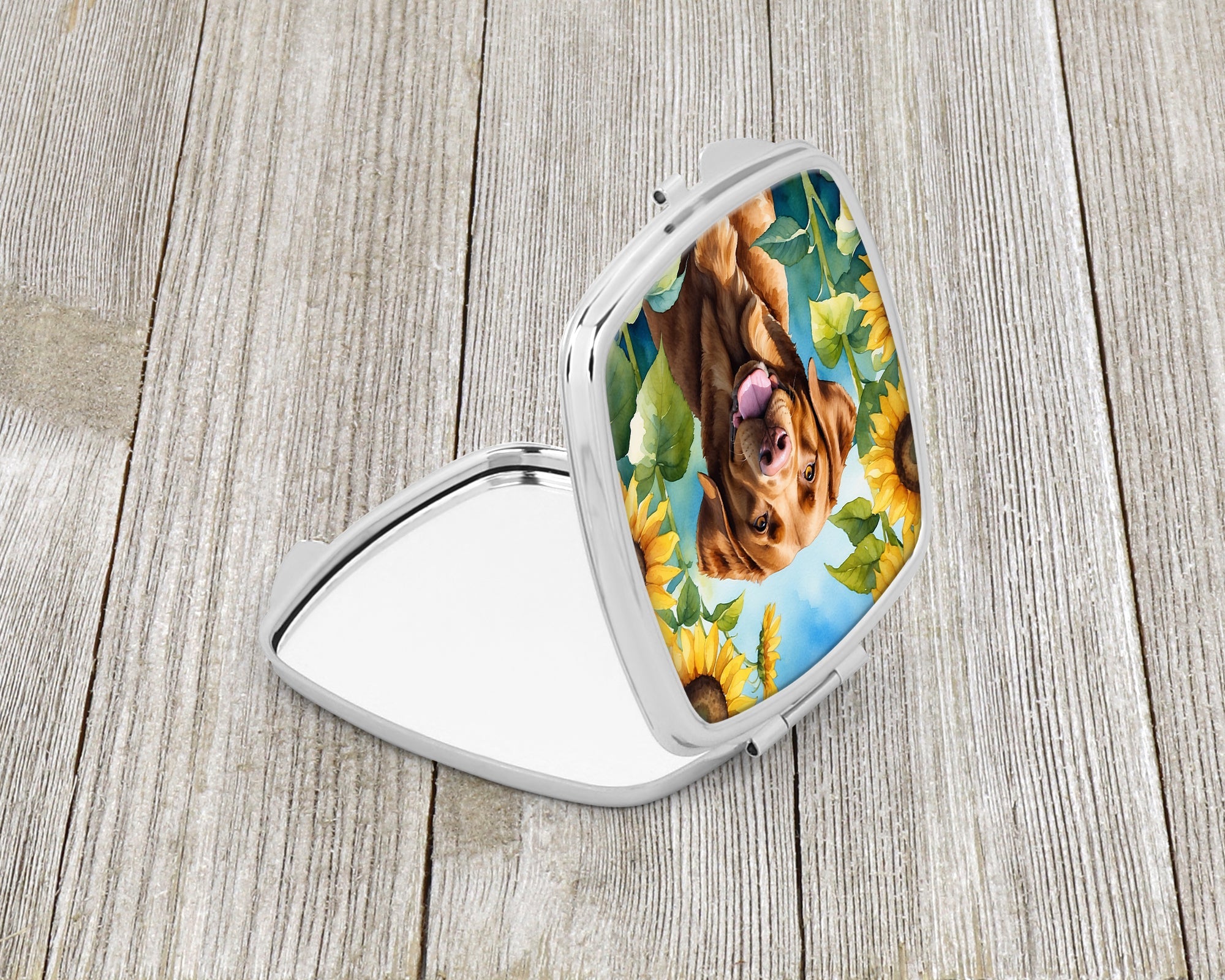 Decorate your space with our Chesapeake Bay Retriever artwork on a Compact Mirror. Bring a bit of Summer into your home with a Summer Compact Mirror. Introducing our Square Compact Mirror, a blend of elegance, functionality, and compactness, perfect for on-the-go touch-ups. This Silvertone metal mirror, with dimensions of 2.75 inches x 3 inches x .3 inches, fits effortlessly into your purse, handbag, or pocket, ensuring that you can check your appearance anytime, anywhere. Our compact mirror stands out with its eye-catching artwork on the front, adding a dash of style to this practical accessory. It is more than just a mirror; it's a statement piece that reflects your personality and aesthetic. When opened, this compact reveals two mirrors inside, doubling your perspective for precise touch-ups. The Silvertone metal construction ensures durability while maintaining a lightweight feel, making it an ideal everyday carry item. Whether you're rushing to a meeting, prepping for a dinner date, or just need a quick check on your look, our Square Compact Mirror is your reliable companion. Experience the perfect blend of style and practicality with this must-have accessory.