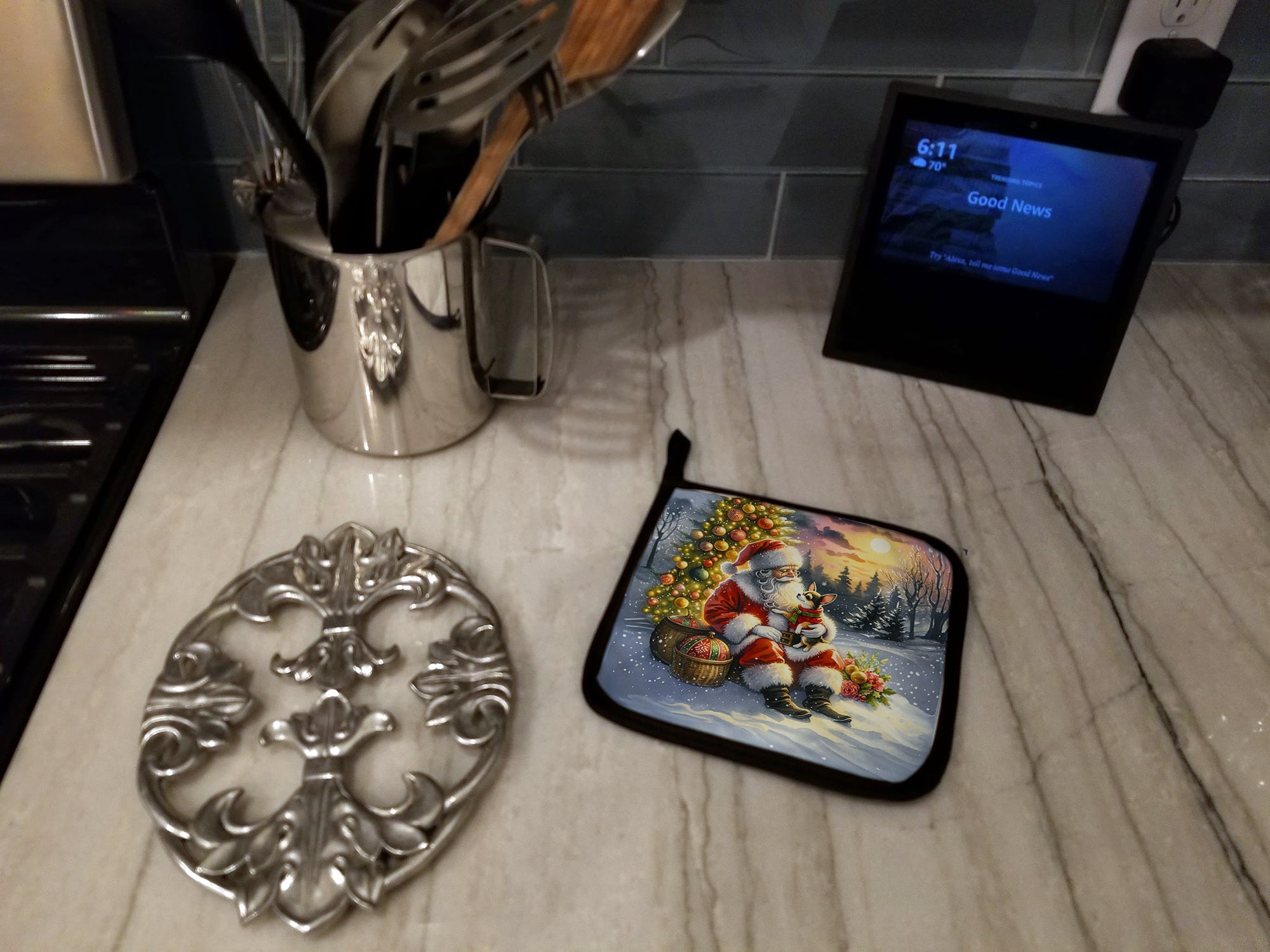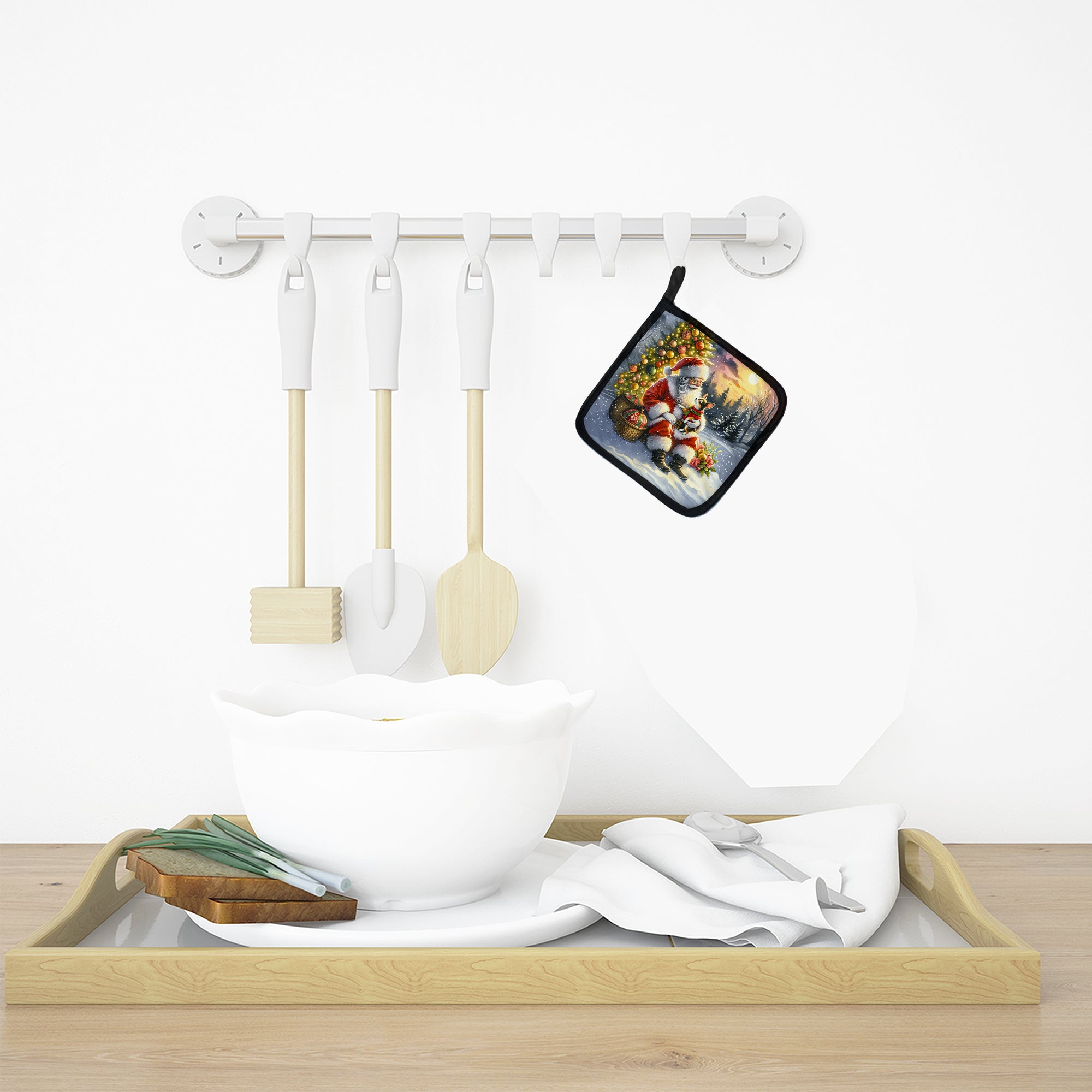 Pair of Pot Holders featuring breed specific Chihuahua artwork. Celebrate Christmas with this Christmas Pair of Pot Holders. A Pair of Pot Holders to match your kitchen decor. Made in the USA these are thick and functional. Full color artwork decorates the front polyester fabric of the hot pad and accented by a black trim. Use these at as a trivet for your Thanksgiving or Christmas tablescape. Filled with insulated fabric and quilted for durability. These colorful pot holders will make a great gift for your favorite home cook or executive chef. Each pot holder measures approximately 7 1/2 inches by 7 1/2 inches. A hanging tab is included.