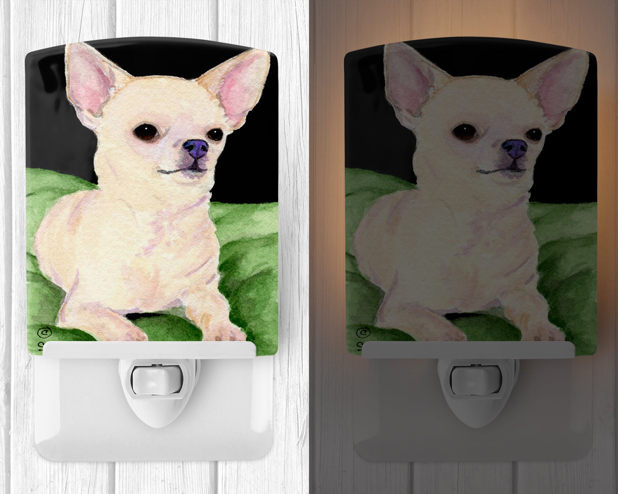 Decorate your space with our Chihuahua artwork on a Night Light. Introduce a splash of artistic flair and subtle illumination to your space with the Decorative Ceramic Night Light from Caroline's Treasures. Perfect for any room, this night light seamlessly blends functionality with an aesthetic appeal, offering a stylish solution to brighten up dark corners of your home or office. Boasting a six-inch high by four-inch wide ceramic tile at the front, it showcases vivid, full-color artwork from distinguished artists, transforming a simple utility into a vibrant art piece. The artwork is securely encased in a robust metal holder, ensuring durability and longevity. Two screws are provided to firmly affix the tile into the holder. The holder extends three inches deep, housing an included bulb that emits a soft, welcoming glow. This product meets all safety standards, as evidenced by its UL approval. Proudly made in the United States from imported components, this Decorative Ceramic Night Light is not just a functional device; it's a statement piece that enhances the ambiance of your surroundings.