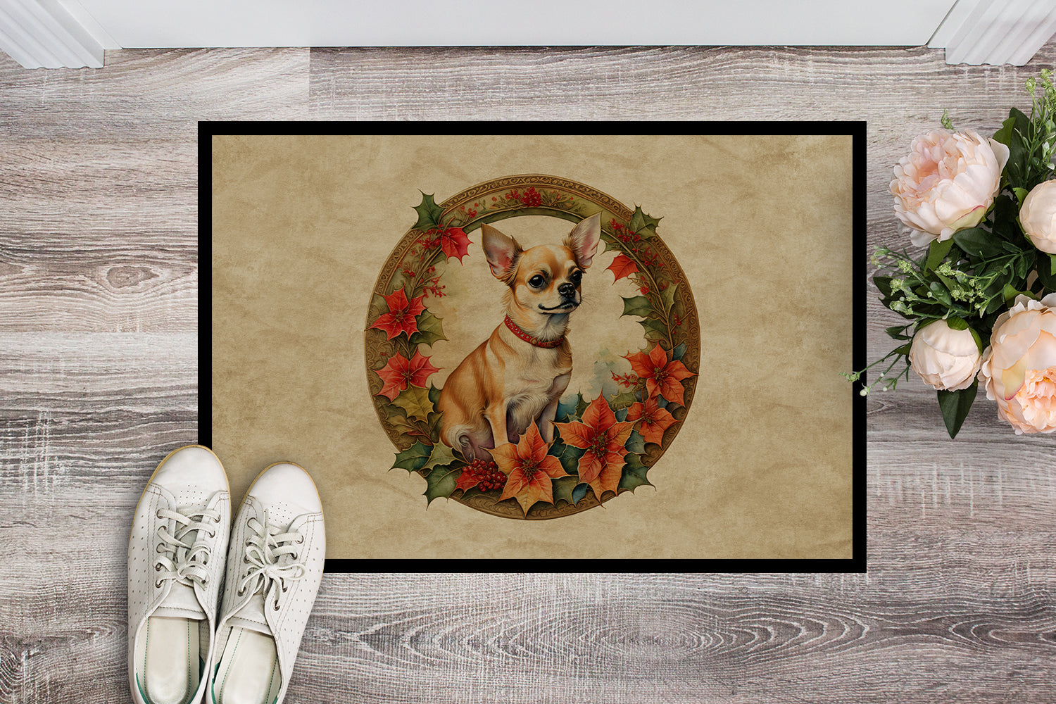 Decorate your space with our Christmas Chihuahua artwork on a Doormat. Bring a bit of Winter into your home with a Winter Doormat. Welcome your guests in style with our Artwork Door Mat, designed to withstand almost any weather condition. This mat, measuring approximately 24 by 36 inches, is held together by durable black binding tape. Its top layer, composed of polyester felt, is dyed with the eye-catching image you see on the mat. A few layers below provide the mat with stability, while its rubber bottom is stamped to help prevent slipping and ensures safety. Our mat works wonderfully as both an indoor or outdoor door mat. For cleaning, simply hose it off with water or use a power washer - no need for any cleaner that produces suds. Avoid scrubbing with a brush, instead, opt for the vacuum on floor setting. Designed manufactured and printed in the USA, this mat is a perfect addition to your porch, outdoor kitchen, entryway, or any indoor space. Its unique design makes it a charming decorative rug that greets your guests and adds a stylish touch to your home decor.