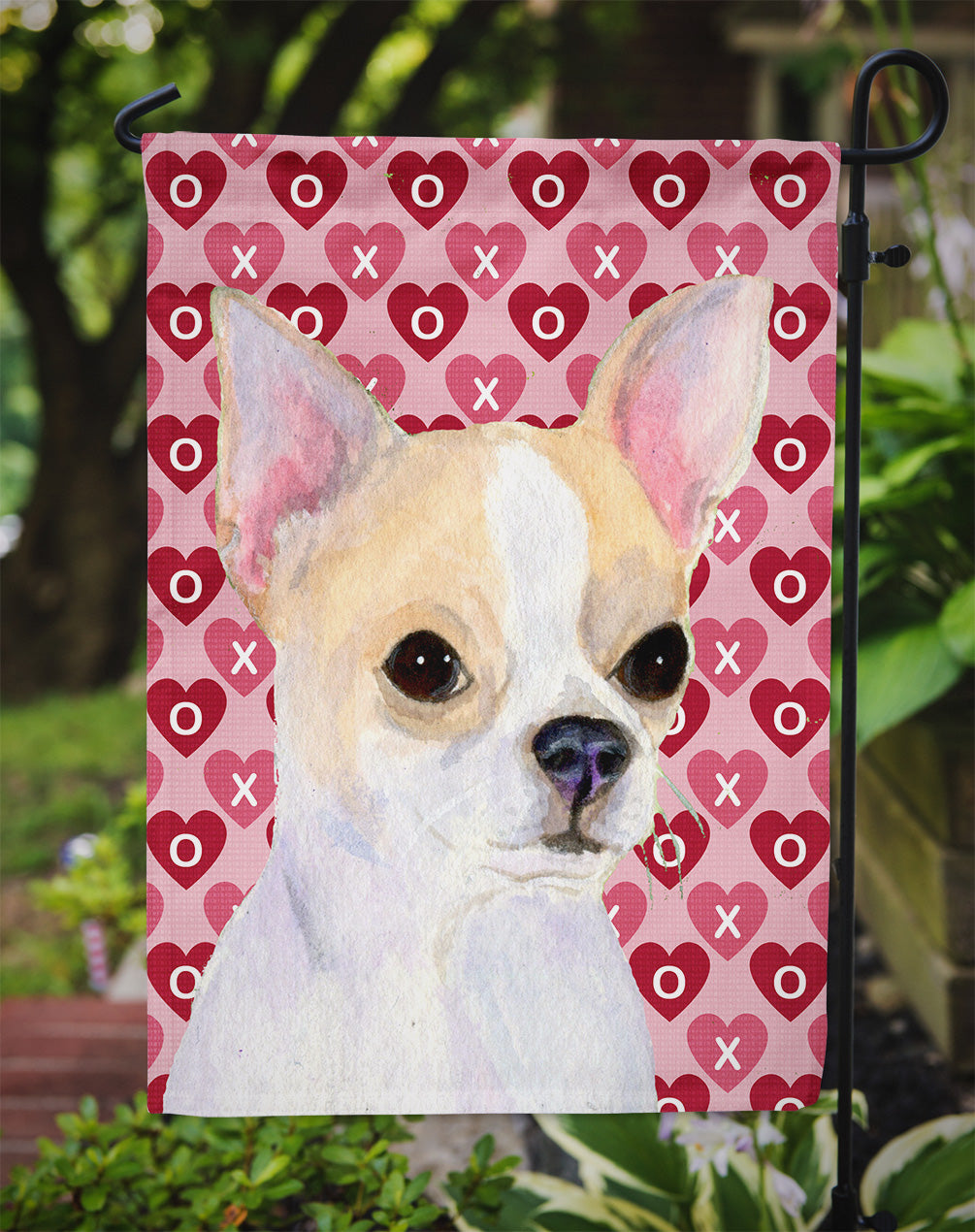 Decorate your space with our Valentine's Day Chihuahua artwork on a Garden Flag. Enhance the beauty of your garden, patio, or yard with Caroline's Treasures Decorative Garden Flag, proudly made in the USA. Crafted from two pieces of thick, double-sided polyester fabric, this 2-ply garden flag is designed to withstand various weather conditions, making it water-resistant and weatherproof. Featuring correctly readable words on both sides, this garden flag offers a delightful visual experience from any angle. With its heavier weight, it stands out among other garden flags, ensuring stability and durability even in wind, rain, and snow. Measuring approximately 11 1/4 inches by 15 1/2 inches, this flag allows you to personalize your outdoor decor. It comes with a 1 1/2-inch sleeve sewn in, allowing easy attachment to any standard garden flag stand or garden size porch hanger (sold separately). Make a statement in your outdoor space with Caroline's Treasures Decorative Garden Flag, a vibrant and high-quality flag that adds color and personality to your surroundings. Proudly made in the USA, it's a symbol of quality craftsmanship and attention to detail.