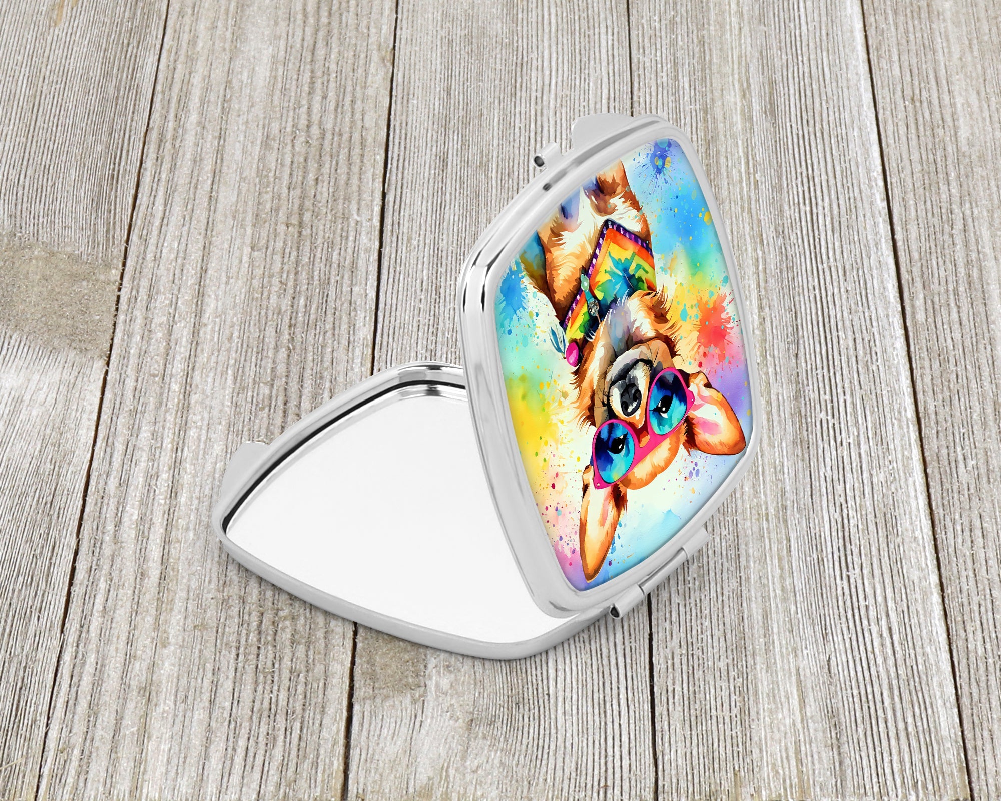 Decorate your space with our Chihuahua artwork on a Compact Mirror. Bring a bit of Summer into your home with a Summer Compact Mirror. Introducing our Square Compact Mirror, a blend of elegance, functionality, and compactness, perfect for on-the-go touch-ups. This Silvertone metal mirror, with dimensions of 2.75 inches x 3 inches x .3 inches, fits effortlessly into your purse, handbag, or pocket, ensuring that you can check your appearance anytime, anywhere. Our compact mirror stands out with its eye-catching artwork on the front, adding a dash of style to this practical accessory. It is more than just a mirror; it's a statement piece that reflects your personality and aesthetic. When opened, this compact reveals two mirrors inside, doubling your perspective for precise touch-ups. The Silvertone metal construction ensures durability while maintaining a lightweight feel, making it an ideal everyday carry item. Whether you're rushing to a meeting, prepping for a dinner date, or just need a quick check on your look, our Square Compact Mirror is your reliable companion. Experience the perfect blend of style and practicality with this must-have accessory.