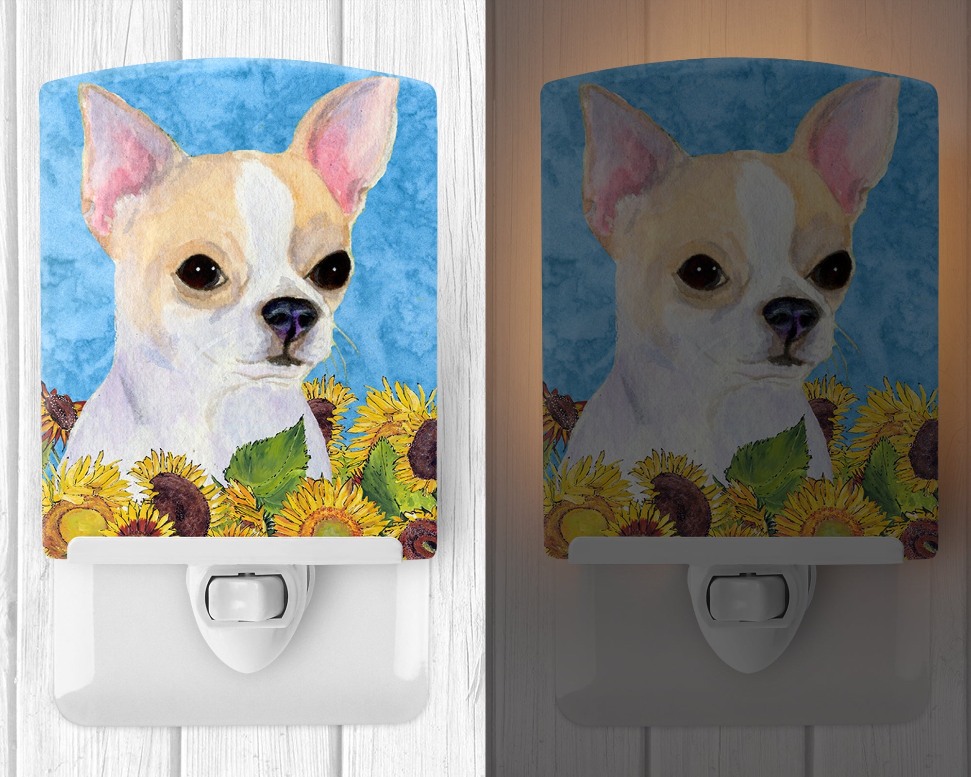 Decorate your space with our Chihuahua artwork on a Night Light. Bring a bit of Summer into your home with a Summer Night Light. Introduce a splash of artistic flair and subtle illumination to your space with the Decorative Ceramic Night Light from Caroline's Treasures. Perfect for any room, this night light seamlessly blends functionality with an aesthetic appeal, offering a stylish solution to brighten up dark corners of your home or office. Boasting a six-inch high by four-inch wide ceramic tile at the front, it showcases vivid, full-color artwork from distinguished artists, transforming a simple utility into a vibrant art piece. The artwork is securely encased in a robust metal holder, ensuring durability and longevity. Two screws are provided to firmly affix the tile into the holder. The holder extends three inches deep, housing an included bulb that emits a soft, welcoming glow. This product meets all safety standards, as evidenced by its UL approval. Proudly made in the United States from imported components, this Decorative Ceramic Night Light is not just a functional device; it's a statement piece that enhances the ambiance of your surroundings.