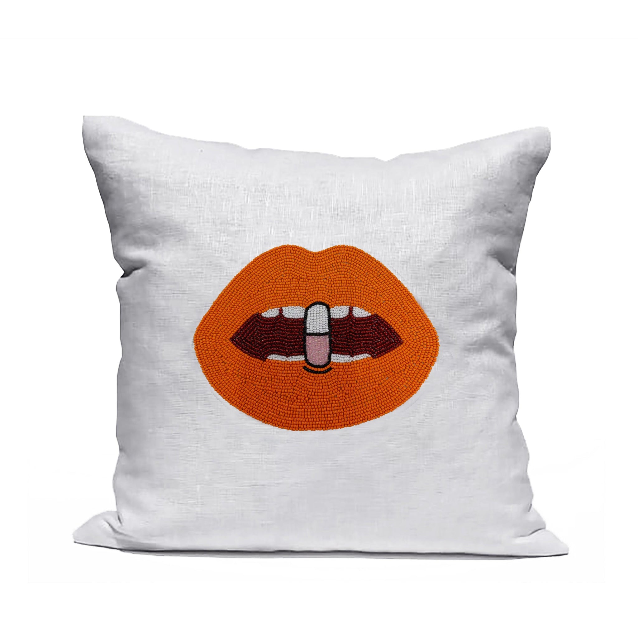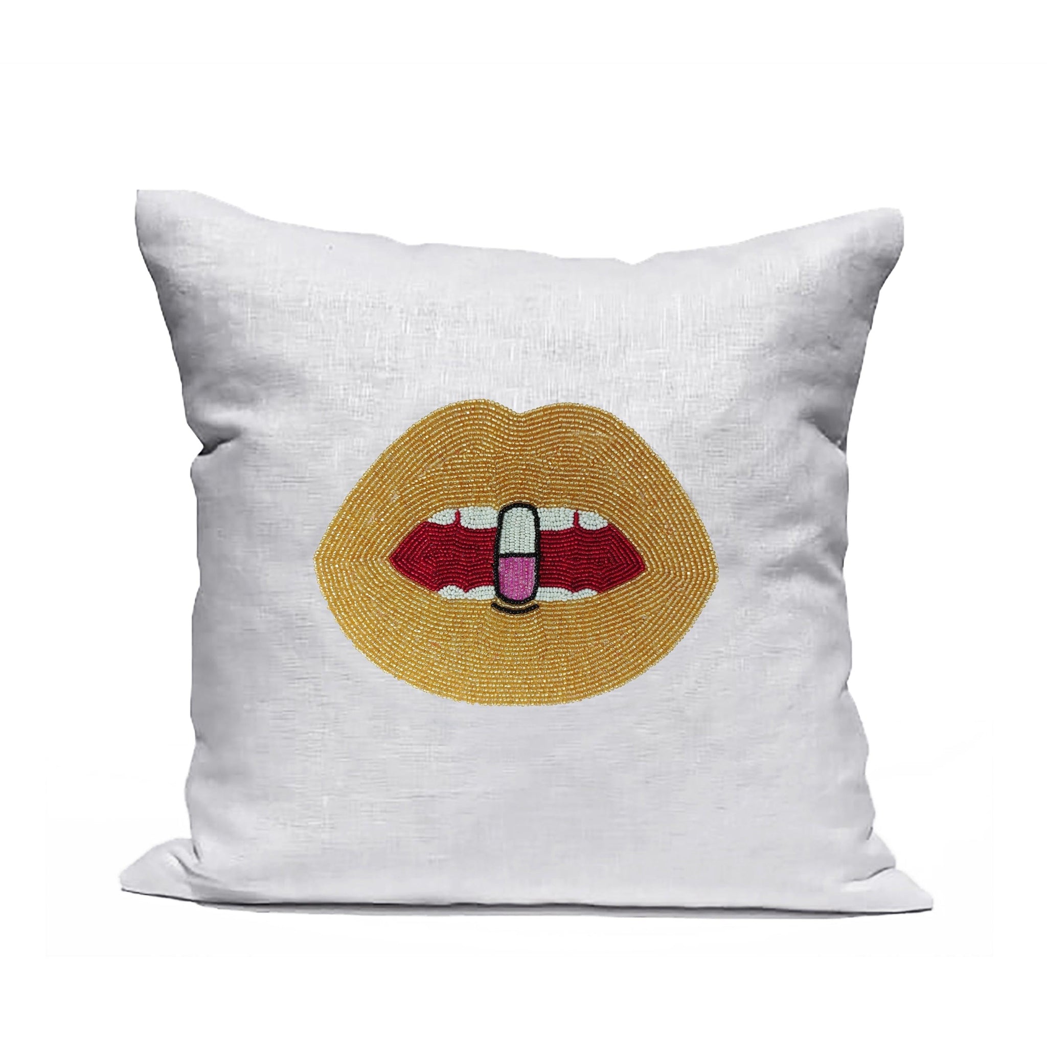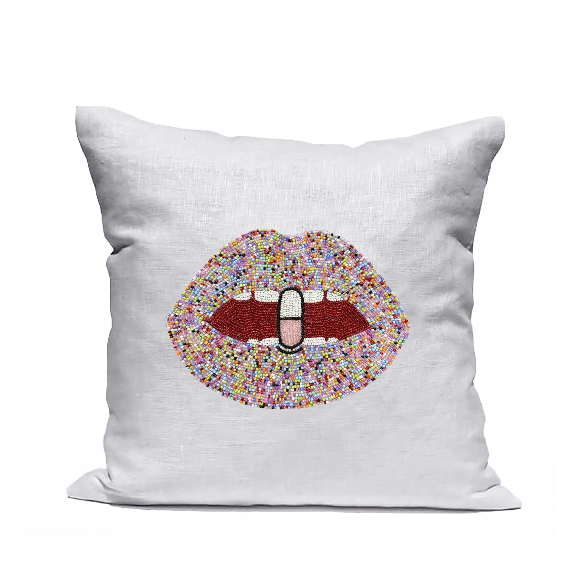 This white linen pillow cover with chill pill theme looks pop-art-ish delightful. Its one more to our collection of pop art pillow covers. This pillow cover brings together Mod style and Pop Art right to your home décor. The bright pop of color is young and bright, a wonder punctuation for your pillows.