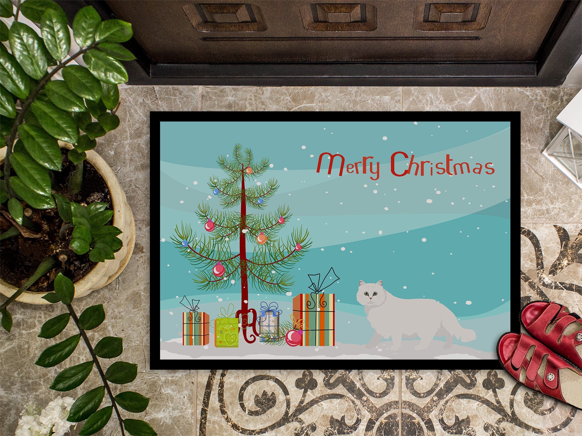 Decorate your space with our Christmas Persian Longhair artwork on a Doormat. Welcome your guests in style with our Artwork Door Mat, designed to withstand almost any weather condition. This mat, measuring approximately 24 by 36 inches, is held together by durable black binding tape. Its top layer, composed of polyester felt, is dyed with the eye-catching image you see on the mat. A few layers below provide the mat with stability, while its rubber bottom is stamped to help prevent slipping and ensures safety. Our mat works wonderfully as both an indoor or outdoor door mat. For cleaning, simply hose it off with water or use a power washer - no need for any cleaner that produces suds. Avoid scrubbing with a brush, instead, opt for the vacuum on floor setting. Designed manufactured and printed in the USA, this mat is a perfect addition to your porch, outdoor kitchen, entryway, or any indoor space. Its unique design makes it a charming decorative rug that greets your guests and adds a stylish touch to your home decor.