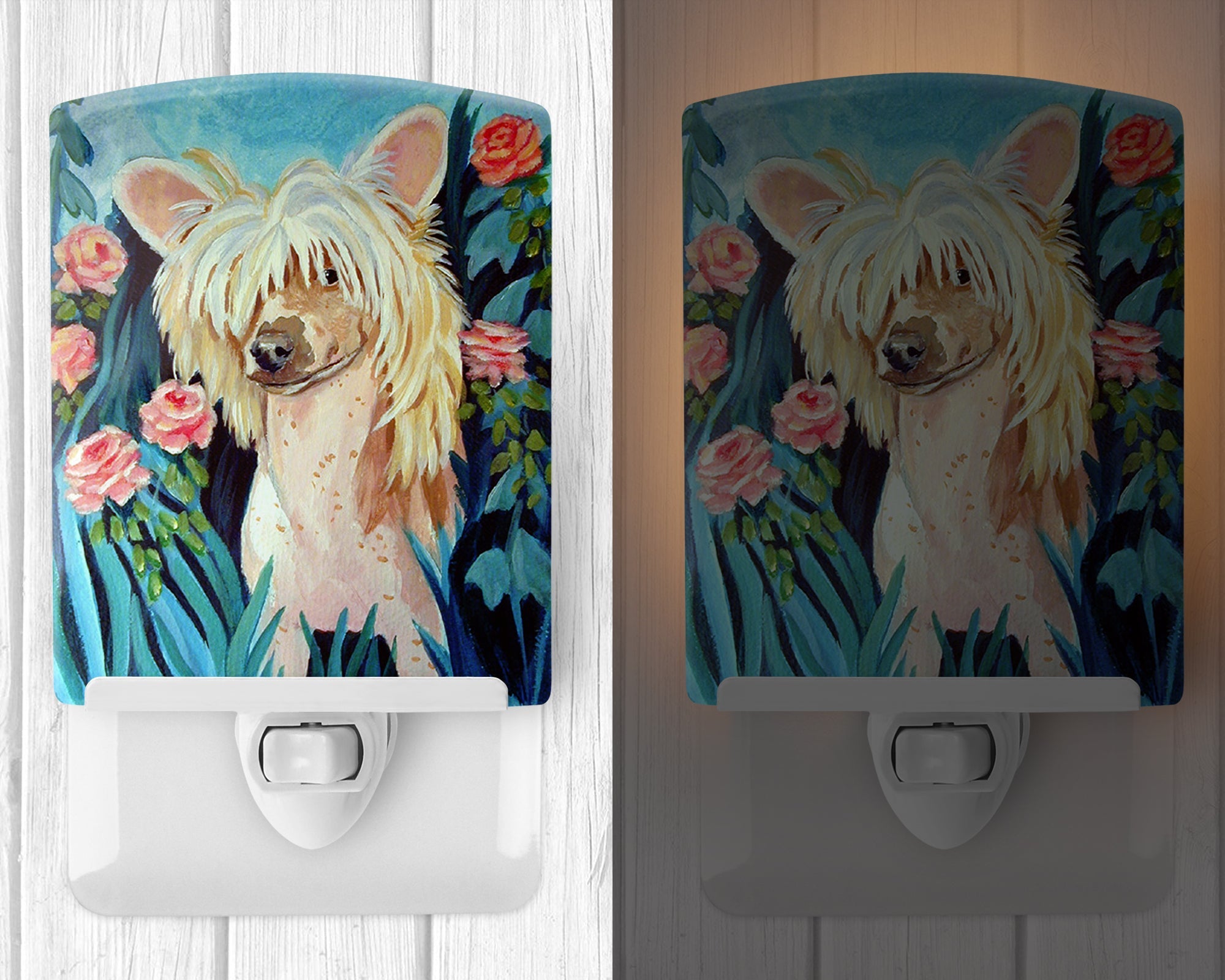 Decorate your space with our Chinese Crested artwork on a Night Light. Introduce a splash of artistic flair and subtle illumination to your space with the Decorative Ceramic Night Light from Caroline's Treasures. Perfect for any room, this night light seamlessly blends functionality with an aesthetic appeal, offering a stylish solution to brighten up dark corners of your home or office. Boasting a six-inch high by four-inch wide ceramic tile at the front, it showcases vivid, full-color artwork from distinguished artists, transforming a simple utility into a vibrant art piece. The artwork is securely encased in a robust metal holder, ensuring durability and longevity. Two screws are provided to firmly affix the tile into the holder. The holder extends three inches deep, housing an included bulb that emits a soft, welcoming glow. This product meets all safety standards, as evidenced by its UL approval. Proudly made in the United States from imported components, this Decorative Ceramic Night Light is not just a functional device; it's a statement piece that enhances the ambiance of your surroundings.