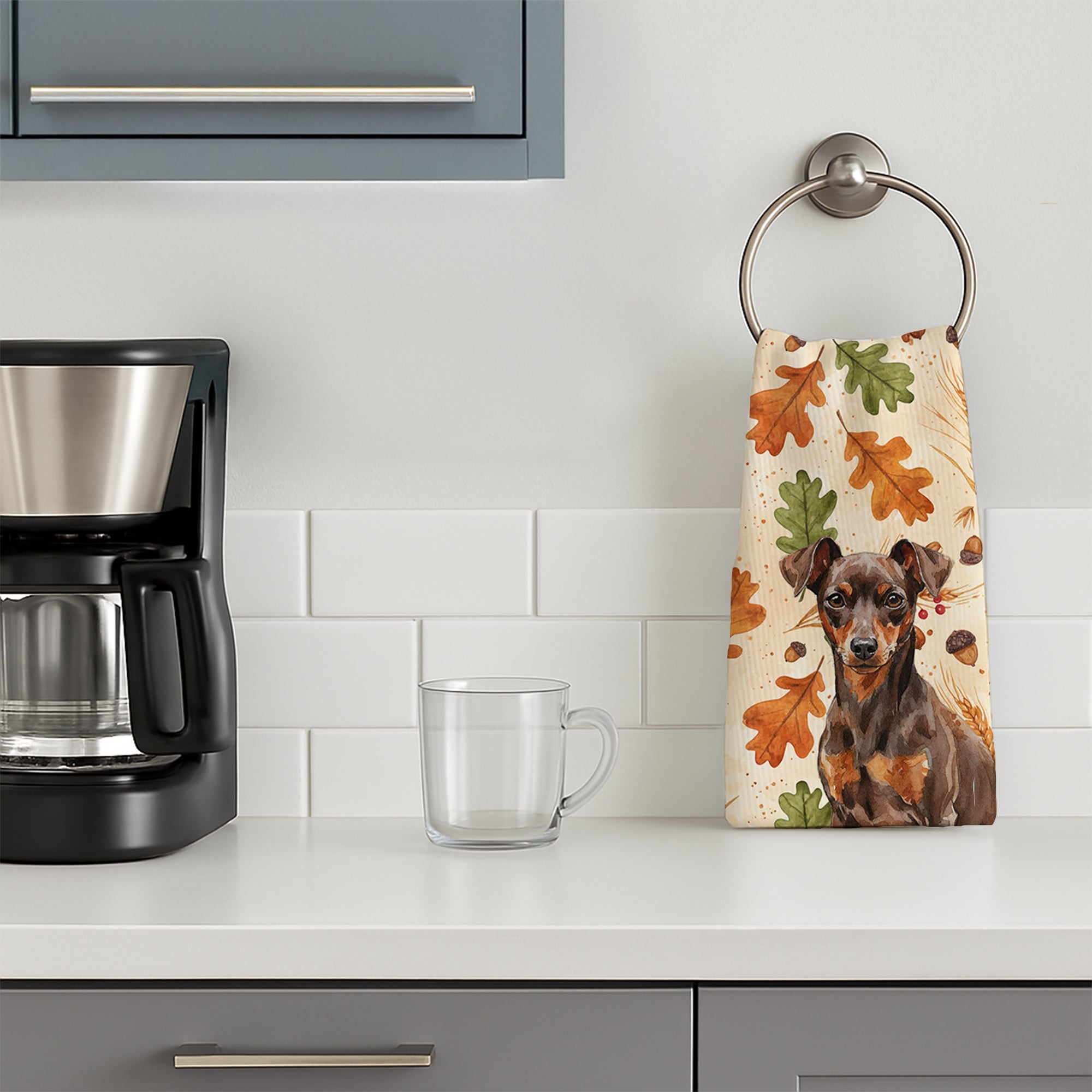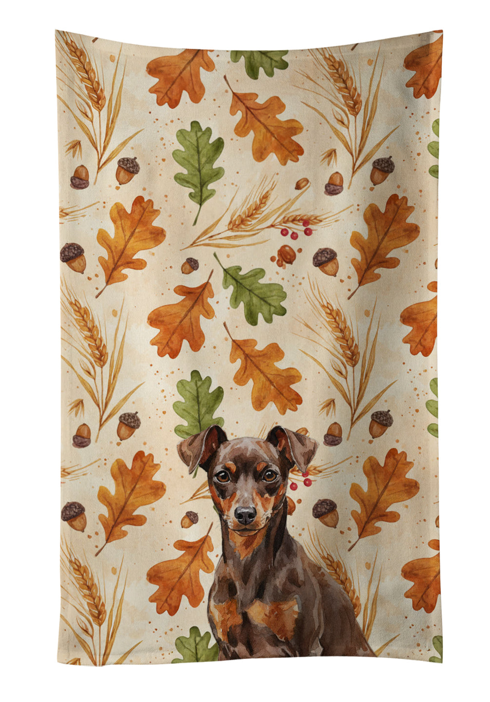 Kitchen Towel featuring breed specific Miniature Pinscher artwork. Celebrate Thanksgiving with this Thanksgiving Kitchen Towel. Bring cozy fall charm to your sink or powder room with a plush velour towel featuring original watercolor artwork. The front is a soft, color-rich minky polyester that polishes glassware to a brilliant shine; the back is 100% white cotton terry loop for quick absorbency on hands, dishes, and counters. Artwork is dyed into the fibers for lasting color that won’t crack or peel. Finished edges keep the shape wash after wash. Size: 15" x 25". Machine wash; tumble dry low. Designed and printed in the USA.