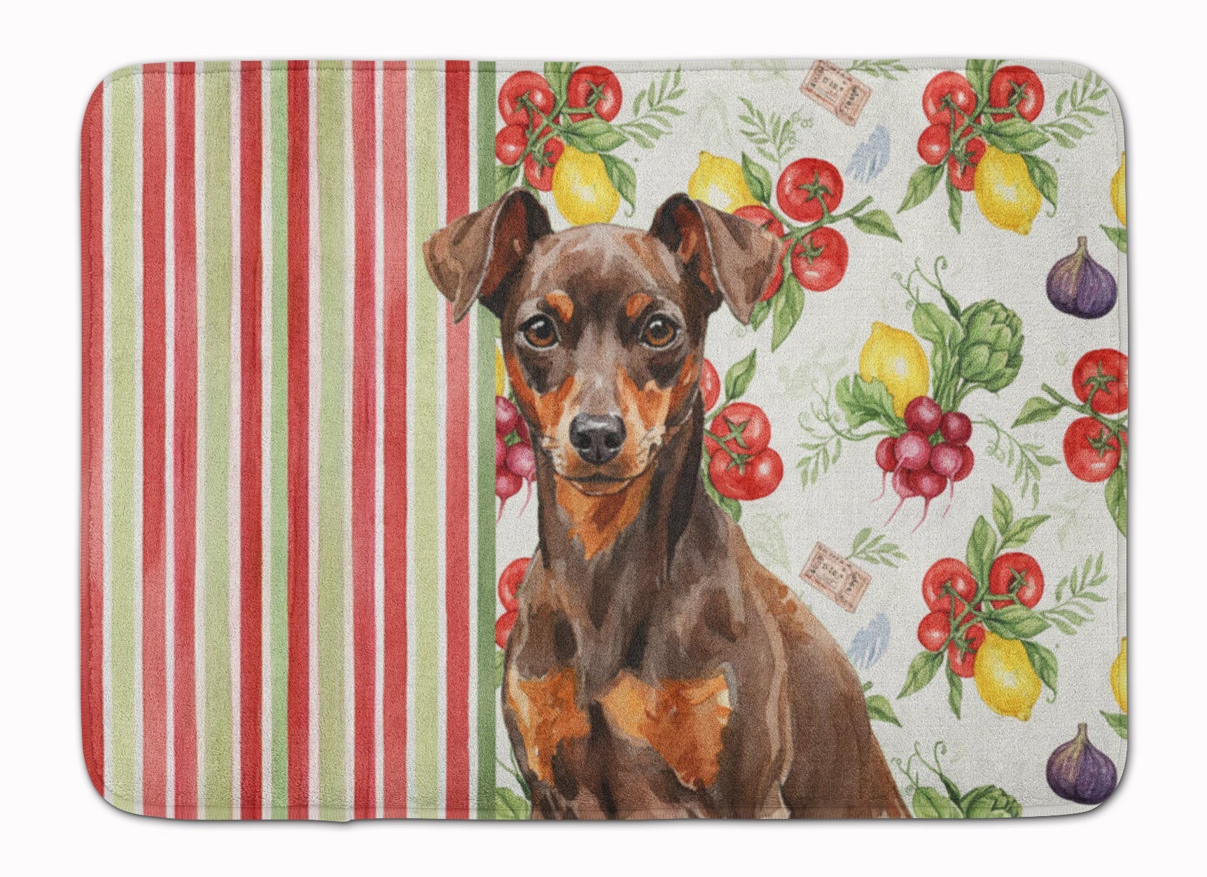 Shown here is the Chocolate and Rust Miniature Pinscher Min Pin Vegetables Memory Foam Kitchen Mat from Caroline's Treasures featuring artwork of a Miniature Pinscher in a Everyday design. The detailed illustration and vibrant colors make it a standout accent that celebrates both seasonal style and love for the subject. This image features a vibrant watercolor vegetable pattern with tomatoes, lemons, artichokes, figs, radishes, and leafy greens arranged in a repeating design, paired with classic red and green stripes. The bright, garden-fresh palette creates a cheerful, farmhouse-inspired look that feels lively, welcoming, and perfect for kitchen décor. Everyday décor celebrates personal style and the small moments that make a house feel like home. Thoughtful designs add warmth and personality that can be enjoyed year-round. Transform your floor into a work of art with Caroline's Treasures' Memory Foam Mat. This mat offers not only a stunning visual appeal but also a luxurious, plush feel that's incredibly comfortable to the touch. It's a versatile, machine-washable mat designed for both bath and kitchen use, ensuring you experience the best in comfort and convenience. Care Instructions: Maintaining this memory foam mat is a breeze. Simply follow the care instructions on the product tag. It's recommended to wash in cold water and dry on a low-temperature setting in the dryer. This ensures the mat retains its quality and longevity, allowing you to enjoy its beauty and comfort for a long time. Caroline's Treasures' Memory Foam Mat Machine Washable is the perfect blend of artistry, comfort, and practicality, making it a standout addition to any space. Upgrade your home decor with this versatile and stylish mat today. Miniature Pinschers, often called Min Pins, are energetic companion dogs known for their confidence and alert personality. This spirited breed is valued for its intelligence and fearless attitude. Makes a heartfelt gift for: Miniature Pinscher owners, Dogs lovers, Everyday gifts, pet parents, friends who adore their Miniature Pinscher, or anyone celebrating Dogs.