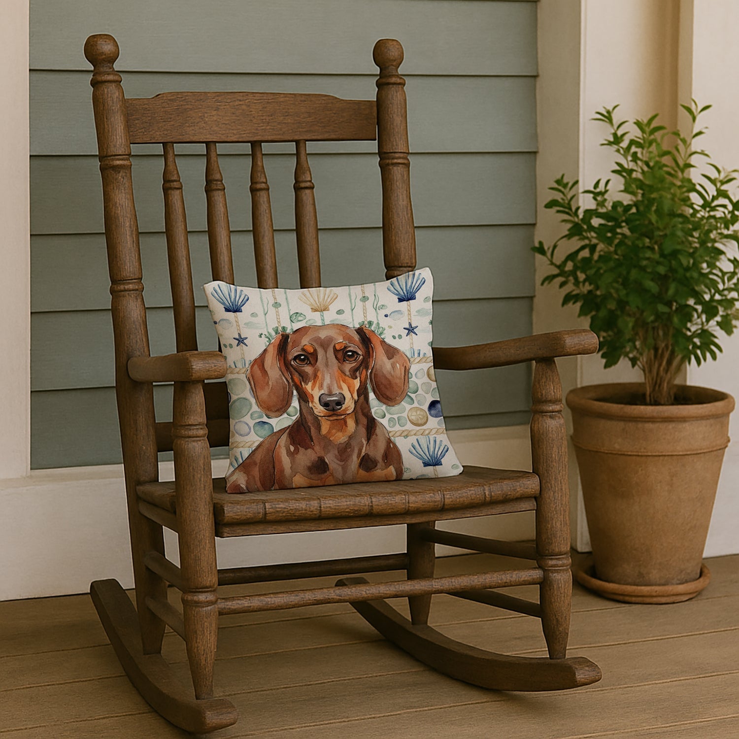 Throw Pillow featuring breed specific Dachshund artwork. Add a touch of vibrancy and comfort to your outdoor seating with Caroline's Treasures Fabric Decorative Pillow. Measuring approximately 14 inches by 14 inches, this outdoor pillow is crafted to elevate the appeal of your patio furniture, infusing it with vivid color and artistic flair. The pillow includes a 100% Polyester Fabric sham filled with a quality pillow form to provide superior comfort. Innovatively made from our brand new material, specifically woven for its water resistance, this pillow is designed for durability. The soft canvas fabric offers versatility in use, fit for your indoor couch or your outdoor patio, porch, or veranda. The fabric is dyed with colorfast dyes built for resilience against weather conditions, ensuring the pillow retains its beauty over time. Constructed by sewing three fabric pieces to create a sham, the polyester insert is then nestled inside to form the pillow, resulting in an overstuffed pillow that maintains its shape. Both the sham and the pillow insert are proudly made in the United States. As the pillows are handcrafted, there may be minor variations in size, further enhancing their unique charm. Experience comfort in style with Caroline's Treasures Fabric Decorative Pillow.