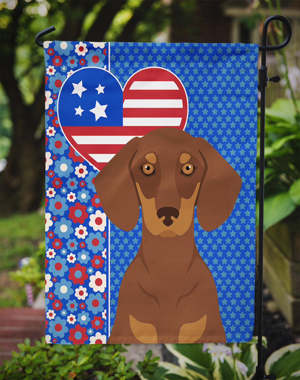 Chocolate and Tan Dachshund Patriotic Heart Garden Flag – Red, White & Blue Dog Decor with Star Background