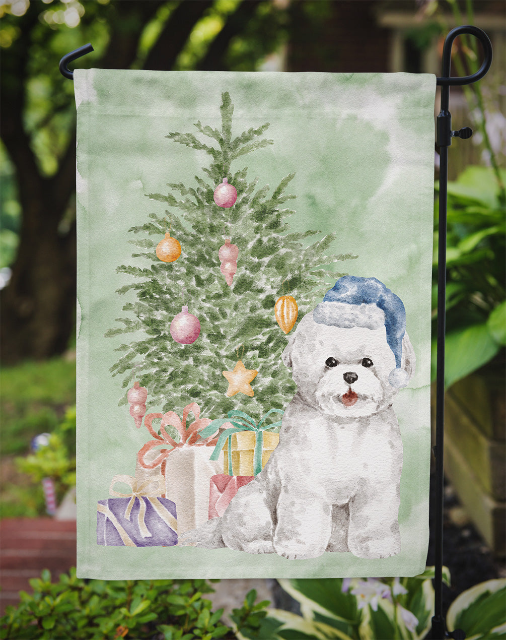 Decorate your space with our Christmas Bichon Frise artwork on a Garden Flag. Enhance the beauty of your garden, patio, or yard with Caroline's Treasures Decorative Garden Flag, proudly made in the USA. Crafted from two pieces of thick, double-sided polyester fabric, this 2-ply garden flag is designed to withstand various weather conditions, making it water-resistant and weatherproof. Featuring correctly readable words on both sides, this garden flag offers a delightful visual experience from any angle. With its heavier weight, it stands out among other garden flags, ensuring stability and durability even in wind, rain, and snow. Measuring approximately 11 1/4 inches by 15 1/2 inches, this flag allows you to personalize your outdoor decor. It comes with a 1 1/2-inch sleeve sewn in, allowing easy attachment to any standard garden flag stand or garden size porch hanger (sold separately). Make a statement in your outdoor space with Caroline's Treasures Decorative Garden Flag, a vibrant and high-quality flag that adds color and personality to your surroundings. Proudly made in the USA, it's a symbol of quality craftsmanship and attention to detail.