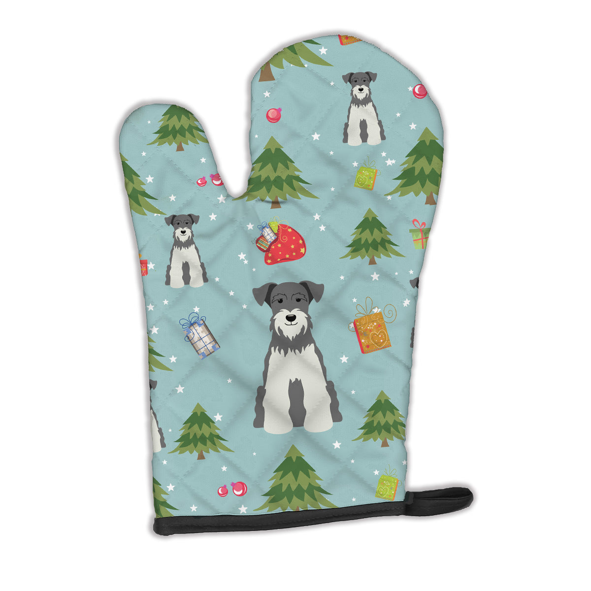 Decorate your space with our Christmas Schnauzer artwork on a Oven Mitt. Presenting our Large Right Hand Thick Heat Resistant Oven Mitt, an indispensable tool for any culinary enthusiast. This mitt boasts layers of quilted protection on both sides, providing outstanding resistance against extreme heat. Embellished with beautifully printed artwork, it adds an extra dash of charm to your kitchen decor. At about 12 inches long and 8 1/2 inches wide, this oven mitt offers a generous fit, accommodating a diverse range of hand sizes. Its design is enhanced by a sleek Black bias tape trim, finished with a convenient hoop for easy hanging. Fresh out of the packaging, the quilting process may give the mitt a stiff feel, but rest assured, it will soften with use and washing. Our mitt is crafted with a unique center fabric, Insul-Bright, a composite material made from polyester fibers, needle-punched through a nonwoven substrate and a reflective metallized film. This smart material resists both conduction and radiant energy, reflecting heat back to its source, all while remaining breathable. Our oven mitt is machine washable and safe for tumble drying. It's a perfect gift for your favorite Chef, BBQ enthusiast, or just a little treat for yourself! Experience safety, style, and convenience rolled into one with this exceptional oven mitt.