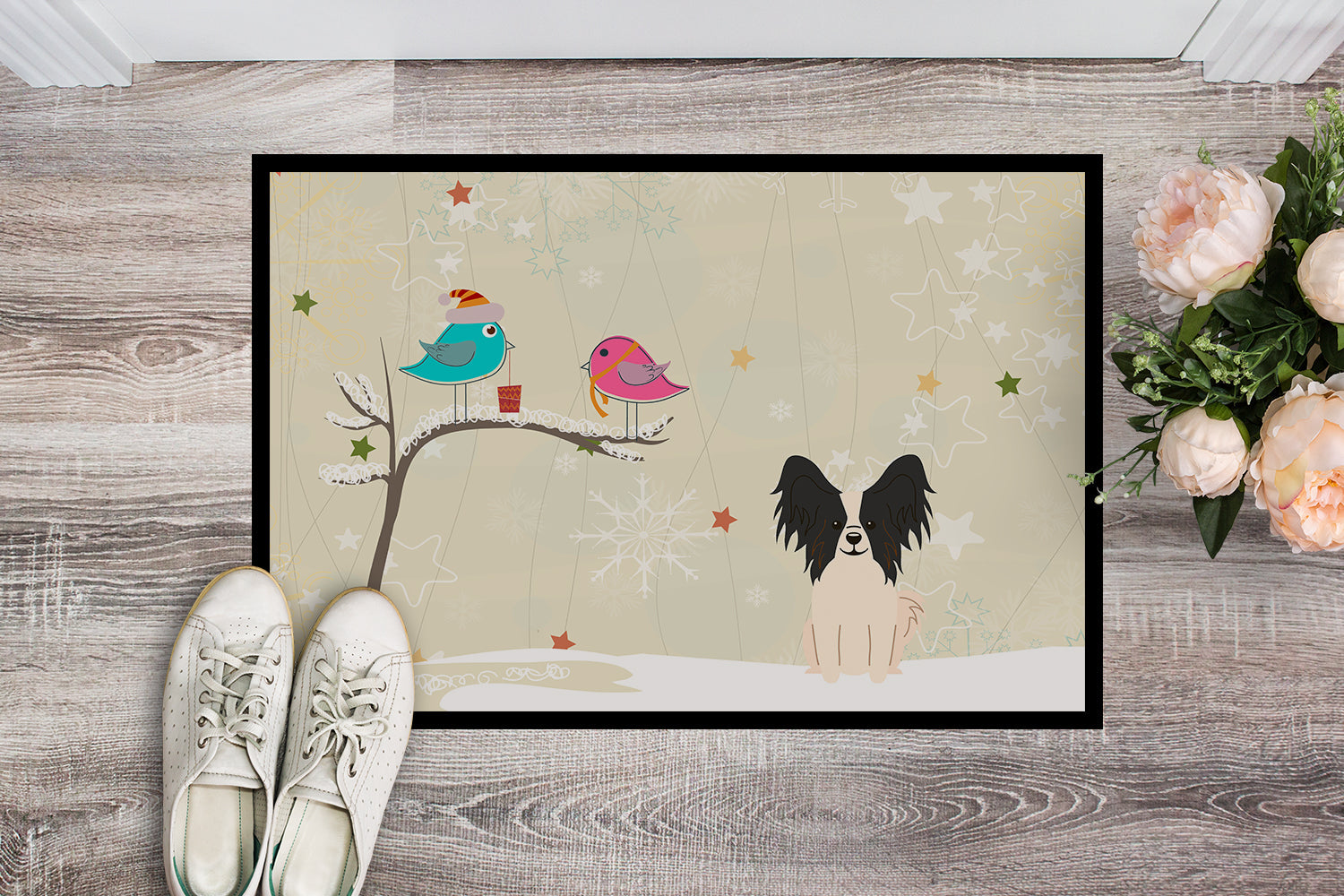 Decorate your space with our Christmas Papillon artwork on a Doormat. Welcome your guests in style with our Artwork Door Mat, designed to withstand almost any weather condition. This mat, measuring approximately 24 by 36 inches, is held together by durable black binding tape. Its top layer, composed of polyester felt, is dyed with the eye-catching image you see on the mat. A few layers below provide the mat with stability, while its rubber bottom is stamped to help prevent slipping and ensures safety. Our mat works wonderfully as both an indoor or outdoor door mat. For cleaning, simply hose it off with water or use a power washer - no need for any cleaner that produces suds. Avoid scrubbing with a brush, instead, opt for the vacuum on floor setting. Designed manufactured and printed in the USA, this mat is a perfect addition to your porch, outdoor kitchen, entryway, or any indoor space. Its unique design makes it a charming decorative rug that greets your guests and adds a stylish touch to your home decor.