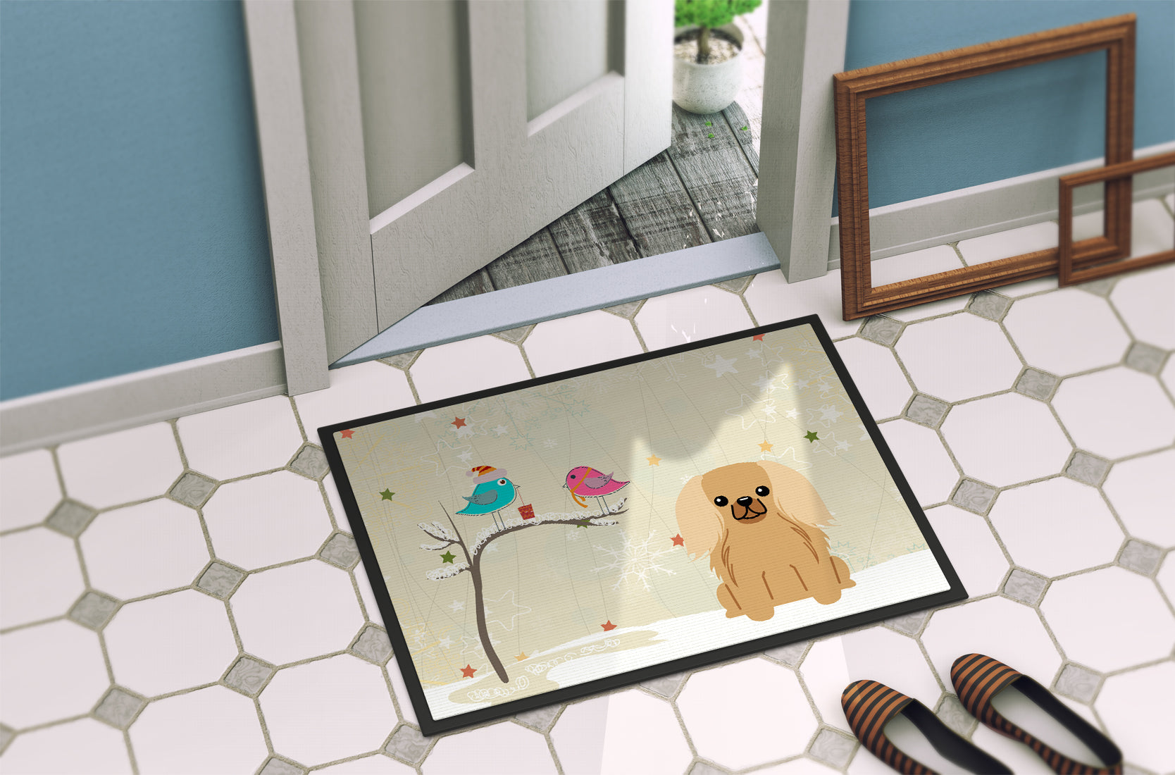 Decorate your space with our Christmas Pekingese artwork on a Doormat. Welcome your guests in style with our Artwork Door Mat, designed to withstand almost any weather condition. This mat, measuring approximately 24 by 36 inches, is held together by durable black binding tape. Its top layer, composed of polyester felt, is dyed with the eye-catching image you see on the mat. A few layers below provide the mat with stability, while its rubber bottom is stamped to help prevent slipping and ensures safety. Our mat works wonderfully as both an indoor or outdoor door mat. For cleaning, simply hose it off with water or use a power washer - no need for any cleaner that produces suds. Avoid scrubbing with a brush, instead, opt for the vacuum on floor setting. Designed manufactured and printed in the USA, this mat is a perfect addition to your porch, outdoor kitchen, entryway, or any indoor space. Its unique design makes it a charming decorative rug that greets your guests and adds a stylish touch to your home decor.