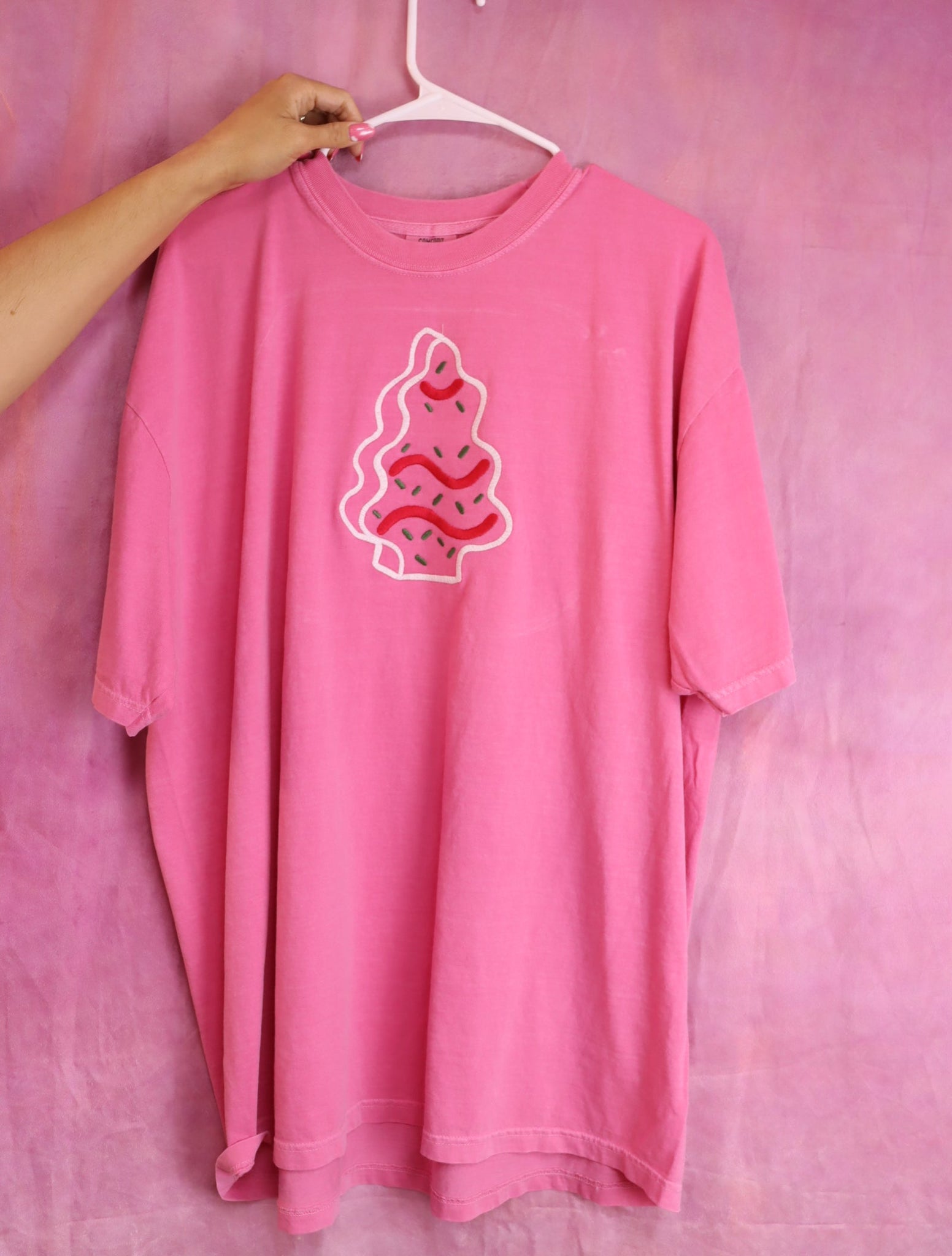 Celebrate the season in style with this charming Christmas Tree Cake Embroidered Shirt. Featuring a delightful vintage-inspired cake design complete with classic vanilla frosting, bold red stripes, and festive green sprinkles, this tee brings nostalgic holiday cheer to your everyday wardrobe.