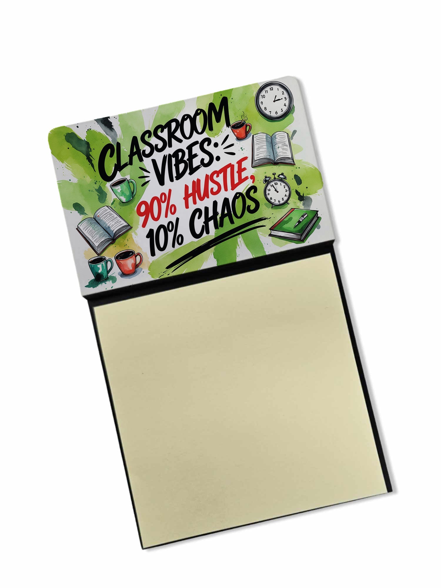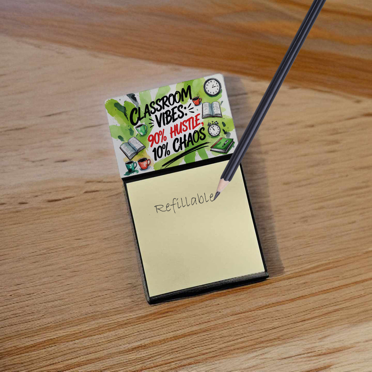 Celebrate the educators who inspire every day with this funny teacher sticky note holder from Caroline’s Treasures. Proudly made in the USA, each design features the phrase Classroom Vibes 90% Hustle, 10% Chaos - in bold, colorful artwork that turns an everyday desk accessory into a thoughtful gift. The sturdy base holds 3" x 3" sticky notes securely while you write, and the glossy aluminum art plate adds a durable, fade-resistant finish that lasts. Refilling is easy—just roll a piece of tape around your finger, press it to the back sheet of a new pad, and attach it to the board. Ideal for classrooms, offices, or home desks, these note holders make a meaningful gift for Teacher Appreciation Week, back-to-school, end-of-year celebrations, or simply saying thank you.