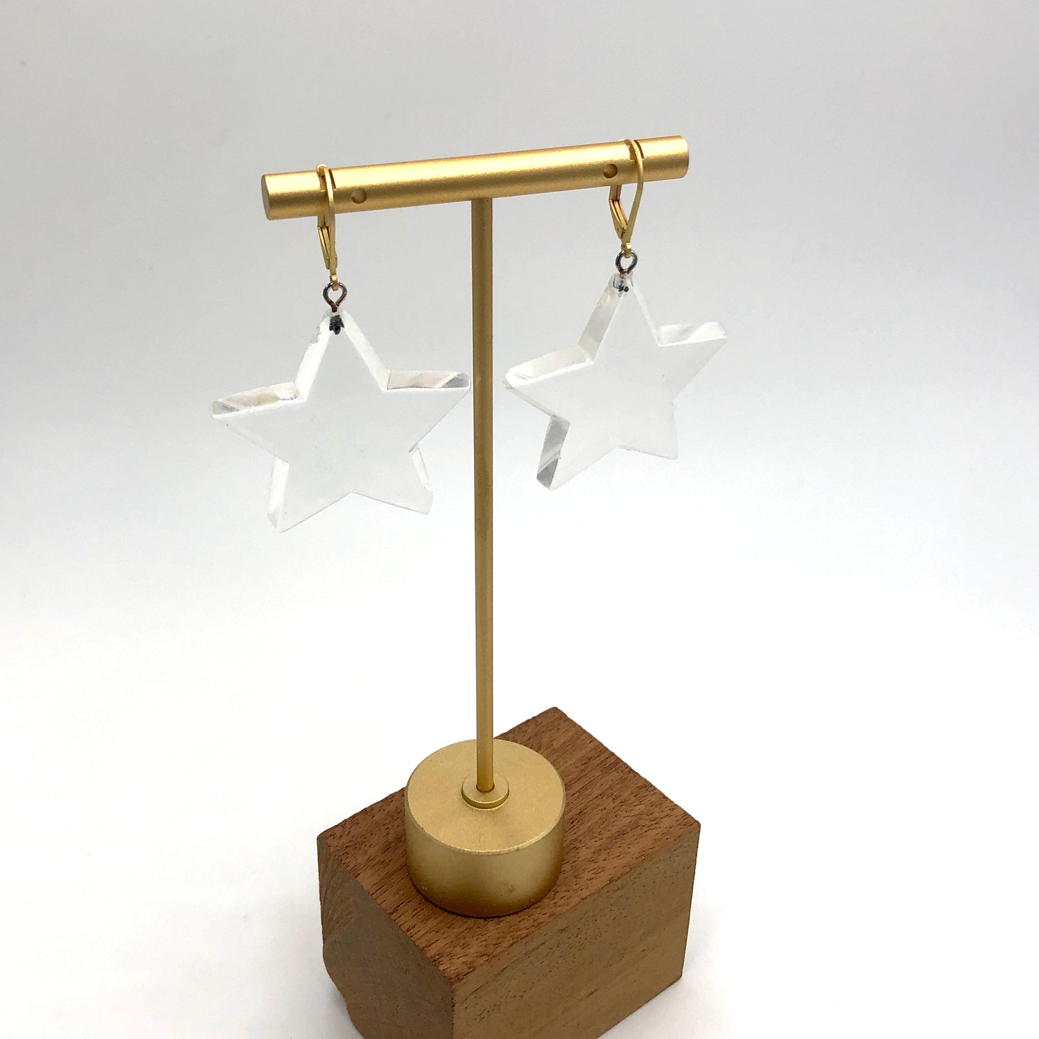 Clear lucite starts drop down from leverback earrings. Lightweight & modern with a nod to the retro style.