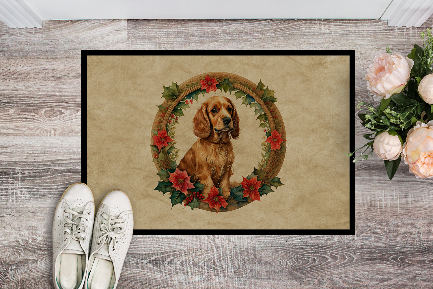 Decorate your space with our Christmas Cocker Spaniel artwork on a Doormat. Bring a bit of Winter into your home with a Winter Doormat. Welcome your guests in style with our Artwork Door Mat, designed to withstand almost any weather condition. This mat, measuring approximately 18 by 27 inches, is held together by durable black binding tape. Its top layer, composed of polyester felt, is dyed with the eye-catching image you see on the mat. A few layers below provide the mat with stability, while its rubber bottom is stamped to help prevent slipping and ensures safety. Our mat works wonderfully as both an indoor or outdoor door mat. For cleaning, simply hose it off with water or use a power washer - no need for any cleaner that produces suds. Avoid scrubbing with a brush, instead, opt for the vacuum on floor setting. Designed manufactured and printed in the USA, this mat is a perfect addition to your porch, outdoor kitchen, entryway, or any indoor space. Its unique design makes it a charming decorative rug that greets your guests and adds a stylish touch to your home decor.