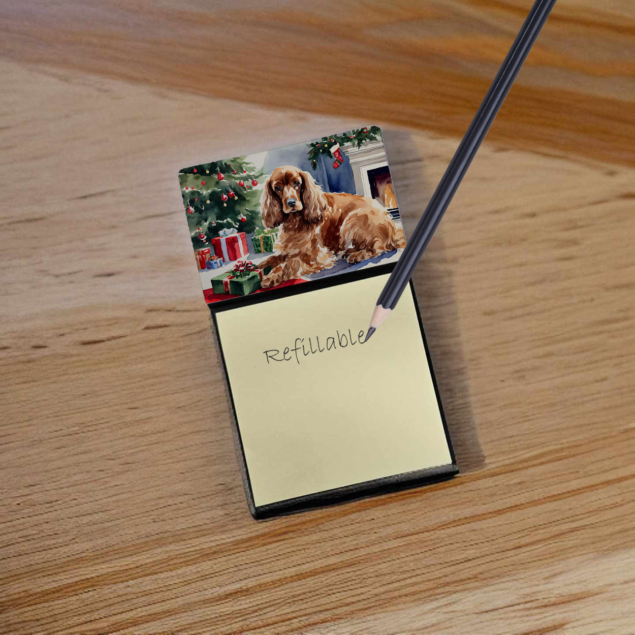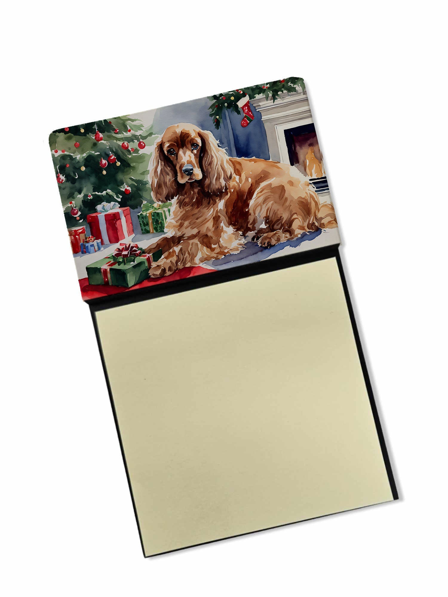 Decorate your space with our Christmas Cocker Spaniel artwork on a Sticky Note Holder. Add a touch of creativity and flair to your desk with the Decorative Sticky Note Holder from Caroline's Treasures. This uniquely designed sticky note dispenser will not only keep your notes in one place but also add an artistic element to your workspace. The top of the holder features beautiful artwork that is sure to catch the eye. Crafted for convenience, this sticky note holder comes with a small pad of 3-inch x 3-inch sticky notes at the bottom. The holder is designed for easy refilling; simply remove the last sheet of a new sticky note pad and stick it onto the board. This feature ensures you will always have sticky notes at your disposal. This Sticky Note Holder makes a perfect gift. Be it for your colleagues at work, your Facebook friends, or even your dog groomer or hairdresser, this versatile product fits the bill. You can use it for making grocery lists, leaving notes for loved ones, or for jotting down important reminders. The bottom board is rigid and can be magnetized by adding a business card size magnet to the back (sold separately). This makes it even more versatile, allowing you to place it on a refrigerator or any other magnetic surface. With this Sticky Note Holder, you're not only organizing your notes, but also personalizing your space.