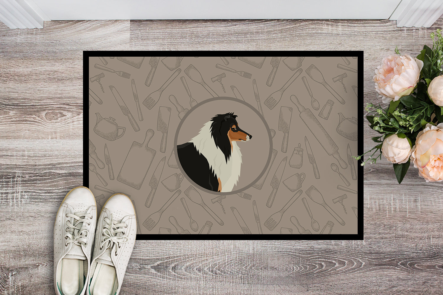 Decorate your space with our Collie artwork on a Doormat. Welcome your guests in style with our Artwork Door Mat, designed to withstand almost any weather condition. This mat, measuring approximately 18 by 27 inches, is held together by durable black binding tape. Its top layer, composed of polyester felt, is dyed with the eye-catching image you see on the mat. A few layers below provide the mat with stability, while its rubber bottom is stamped to help prevent slipping and ensures safety. Our mat works wonderfully as both an indoor or outdoor door mat. For cleaning, simply hose it off with water or use a power washer - no need for any cleaner that produces suds. Avoid scrubbing with a brush, instead, opt for the vacuum on floor setting. Designed manufactured and printed in the USA, this mat is a perfect addition to your porch, outdoor kitchen, entryway, or any indoor space. Its unique design makes it a charming decorative rug that greets your guests and adds a stylish touch to your home decor.