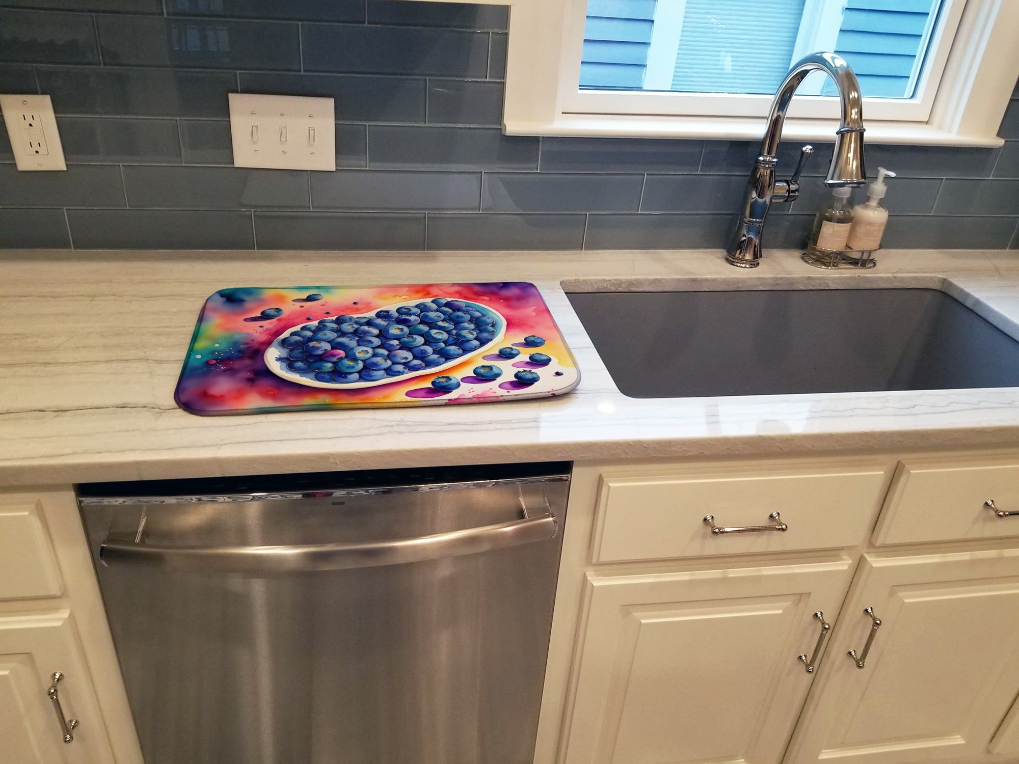 Dish Drying Mat featuring breed specific Blueberries artwork. Say goodbye to messy countertops and soggy dish towels with our innovative dish drying mat. Our high-quality dish drying pad is designed to keep your countertops dry while offering a stylish and efficient solution. Whether you're air drying dishes, glasses, stemware, silverware, pots, pans, bottles, or even fruits and vegetables, our dish mat is the perfect choice. The 14 inches x 22 inches size fits most counters and dish drying racks, and the non-slip design ensures stability. Made with water-absorbent polyester and a polyurethane foam insert, our dish drying mat is not only functional but also durable. It's machine washable and printed in the USA for long-lasting use. The beautiful artwork adds flair to your kitchen decor, making it a perfect housewarming gift or present for any occasion. Upgrade your kitchen experience with our absorbent and versatile dish drying mat.