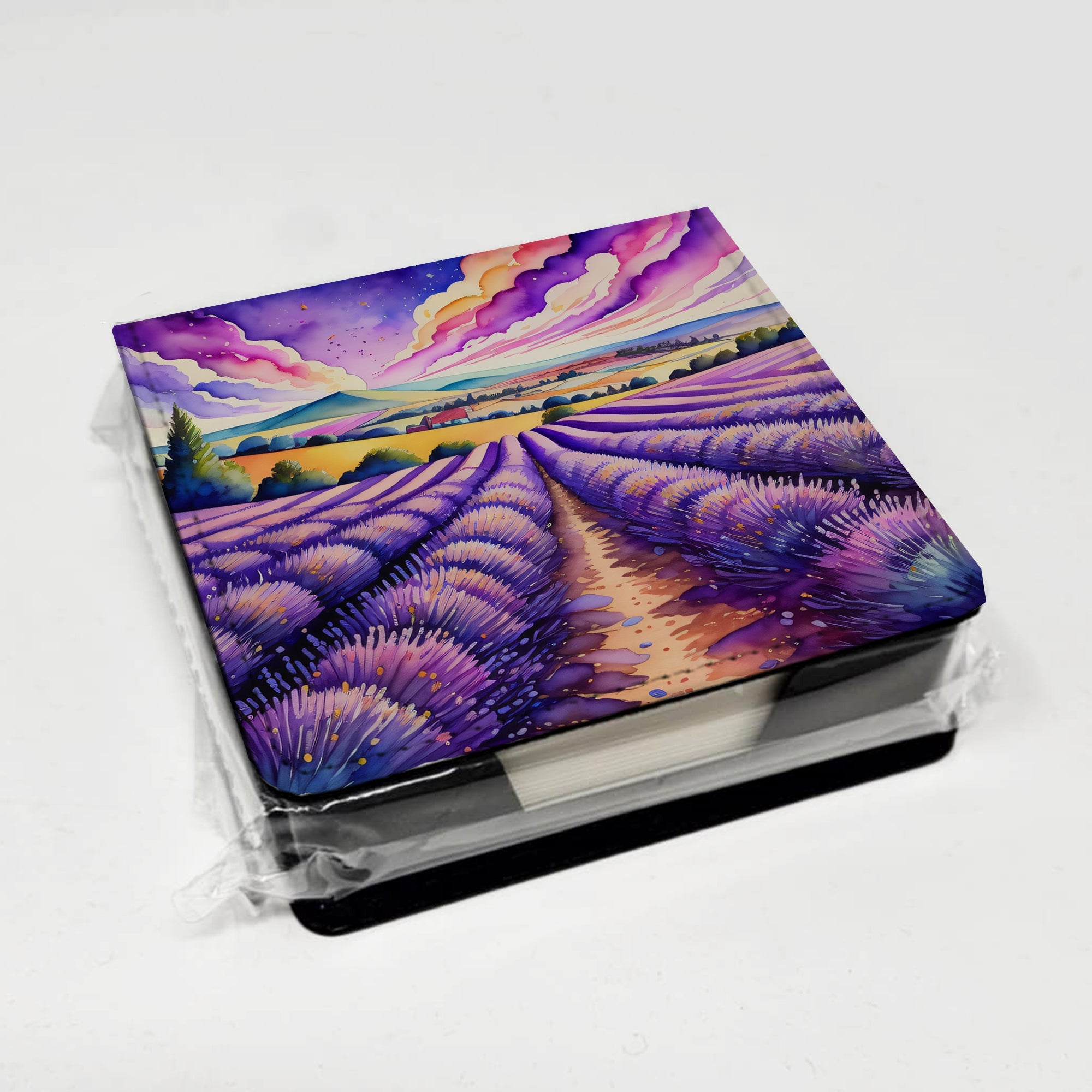 PU Leather Note Paper Holder featuring breed specific English Lavender artwork. Elevate your workspace with this PU Leather Note Paper Holder, crafted to resemble luxurious leather without the use of animal products. Made from durable synthetic PU leather, it offers both a premium look and eco-friendly appeal. This note holder, compactly sized at 4.25 x 4.25 x 1.25 inches, includes about 160 sheets of 3.75 x 3.75-inch note paper—ideal for quick notes and reminders. An exclusive artist-designed cover makes each holder uniquely vibrant, adding a splash of color and personality to any desk or office. The discrete design keeps note paper hidden, maintaining a neat and organized workspace. Perfect as a gift or for personal use, this stylish holder is refillable with standard paper, ensuring long-lasting utility. A must-have for anyone seeking a sophisticated, artful touch to their workspace while supporting animal-friendly products. Add style, organization, and creativity to your everyday routine with this elegant note paper holder.