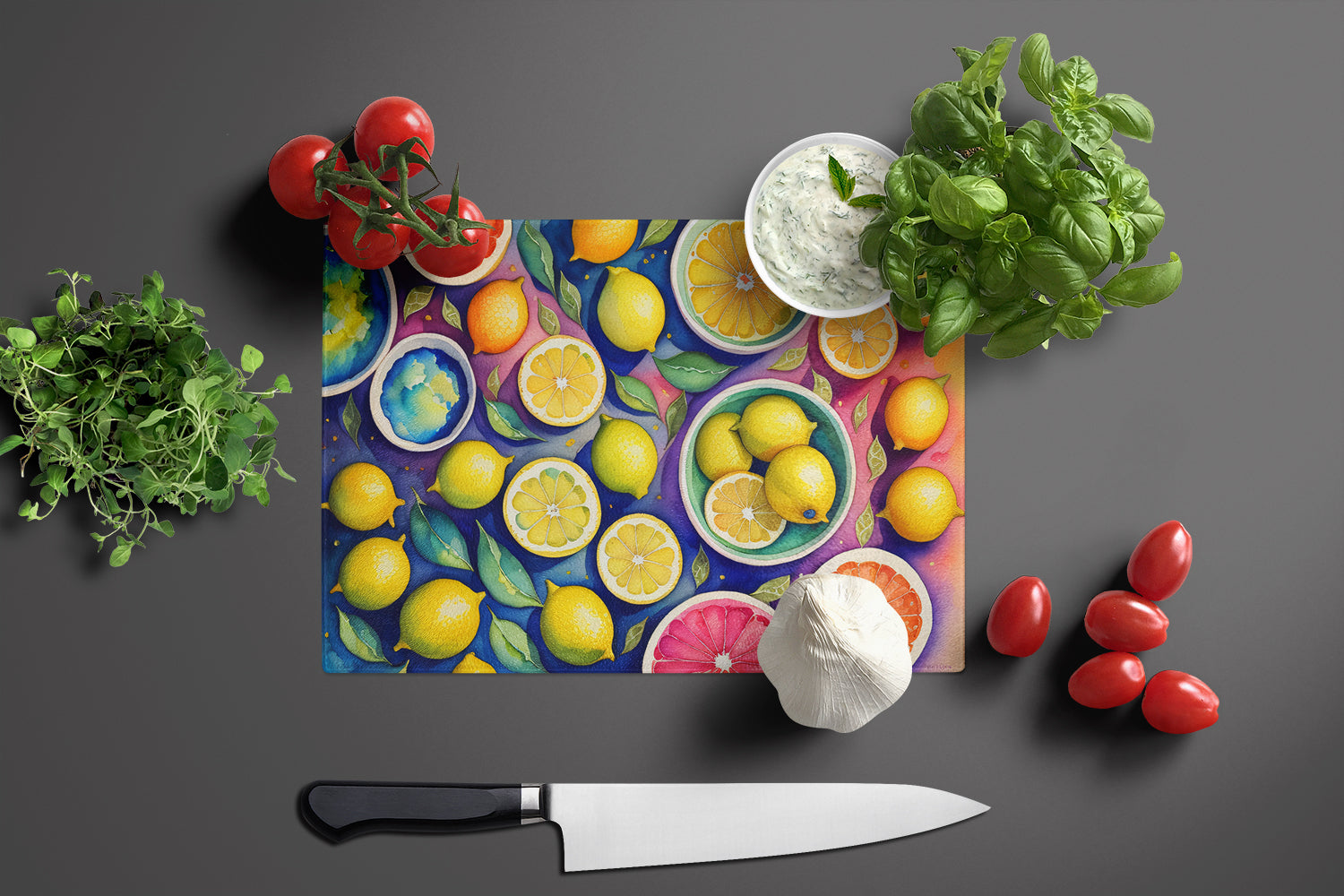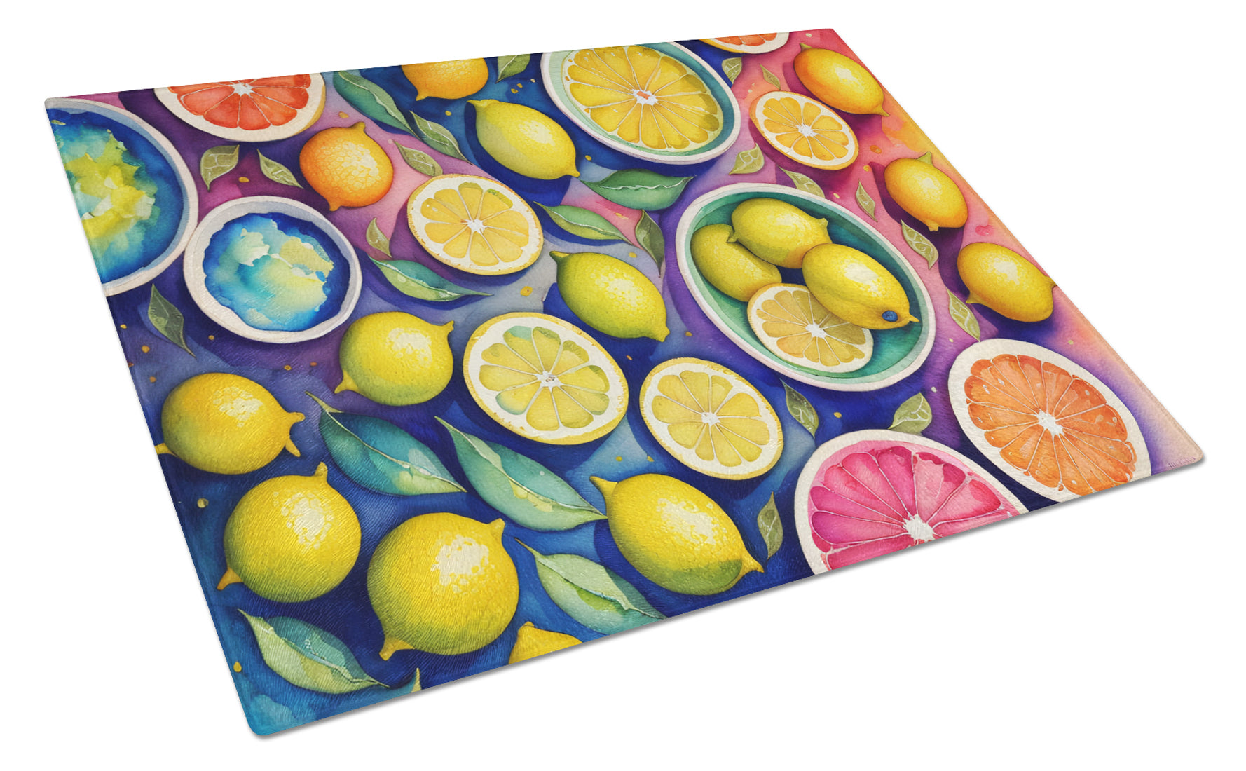 Decorate your space with our Lemons artwork on a Cutting Board. Introduce your kitchen to the vibrant, large Decorative Glass Cutting Board from Caroline's Treasures. Crafted from resilient tempered glass, this board is not only a utilitarian necessity but also a colorful art piece. With its generous dimensions of 15 inches in height and 12 inches in length, it offers ample space for all your cutting needs. Every piece showcases captivating artwork from distinguished artists, bringing an aesthetic edge to your kitchen. Beyond its attractive design, this cutting board ensures your countertop stays pristine and unscathed, owing to its heat-resistant properties. Engineered with user convenience in mind, it features non-skid feet for stability, and rounded corners for additional safety. Its robust construction renders it virtually unbreakable, guaranteeing longevity. The board comes with protective feet bumpers, maintaining its position during use. This product is recommended to be hand washed only. Proudly printed and assembled in the United States, this cutting board exemplifies superior craftsmanship. With Caroline's Treasures' Decorative Glass Cutting Board, you're investing in a blend of functionality and artistic flair.