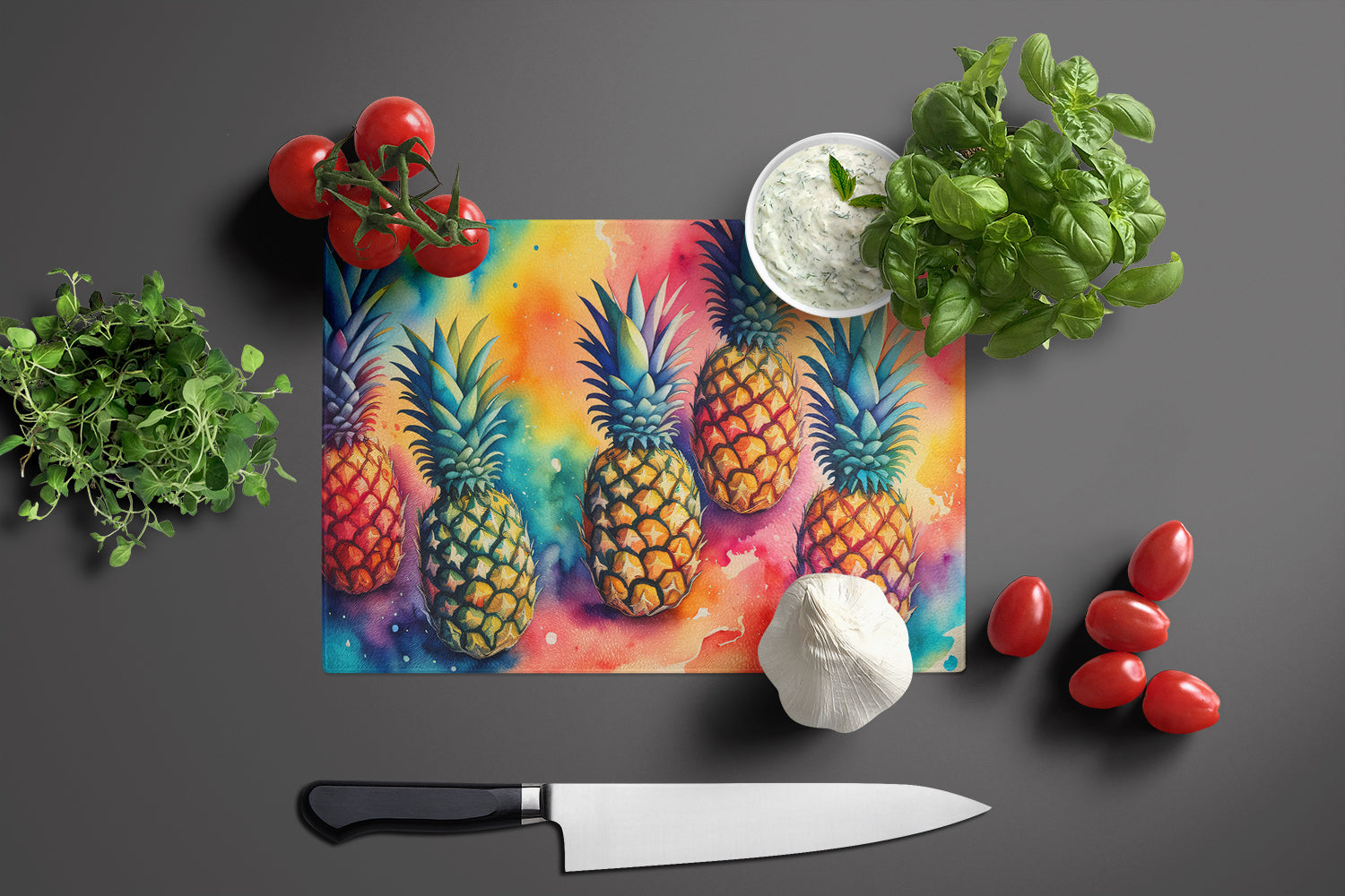 Decorate your space with our Pineapples artwork on a Cutting Board. Introduce your kitchen to the vibrant, large Decorative Glass Cutting Board from Caroline's Treasures. Crafted from resilient tempered glass, this board is not only a utilitarian necessity but also a colorful art piece. With its generous dimensions of 15 inches in height and 12 inches in length, it offers ample space for all your cutting needs. Every piece showcases captivating artwork from distinguished artists, bringing an aesthetic edge to your kitchen. Beyond its attractive design, this cutting board ensures your countertop stays pristine and unscathed, owing to its heat-resistant properties. Engineered with user convenience in mind, it features non-skid feet for stability, and rounded corners for additional safety. Its robust construction renders it virtually unbreakable, guaranteeing longevity. The board comes with protective feet bumpers, maintaining its position during use. This product is recommended to be hand washed only. Proudly printed and assembled in the United States, this cutting board exemplifies superior craftsmanship. With Caroline's Treasures' Decorative Glass Cutting Board, you're investing in a blend of functionality and artistic flair.
