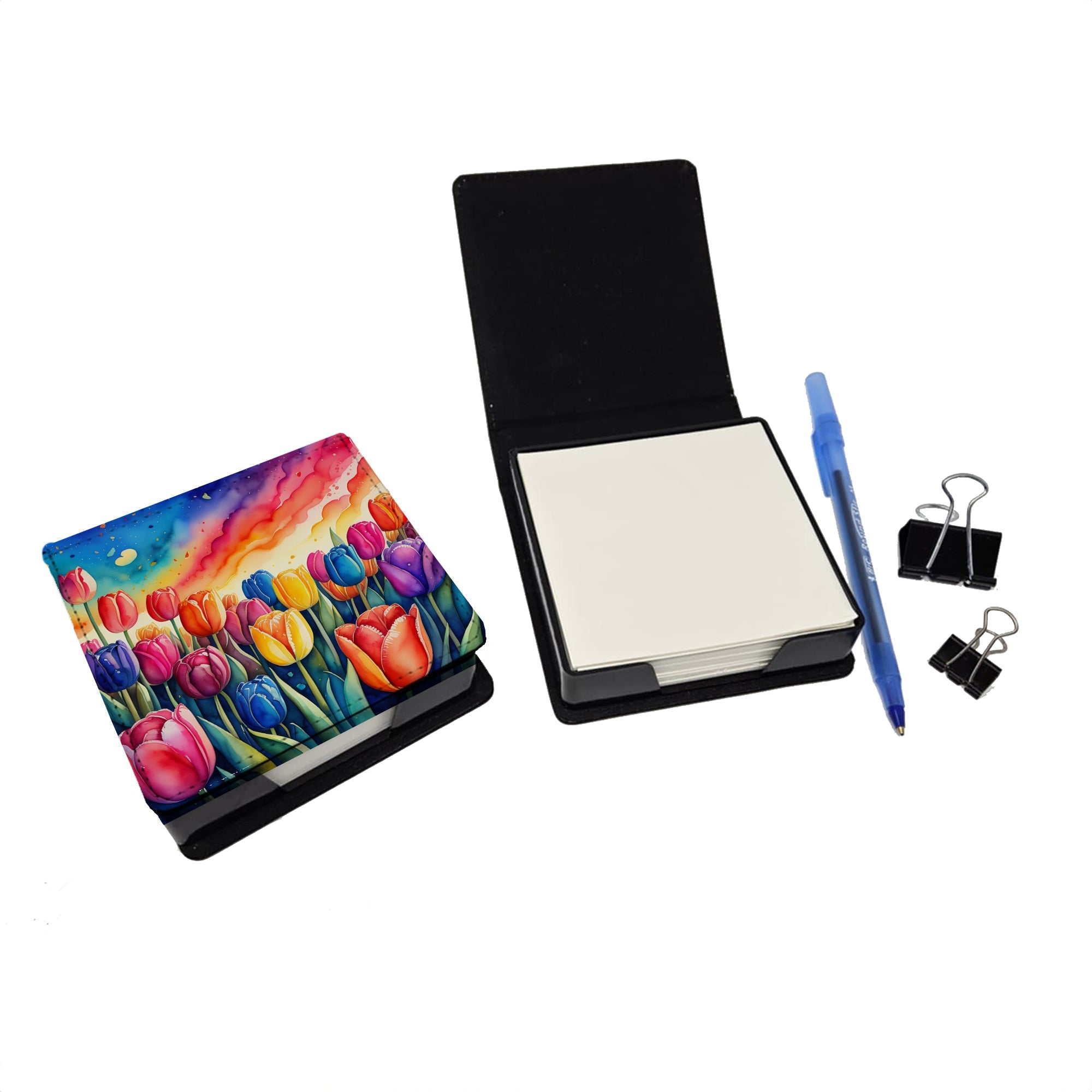 PU Leather Note Paper Holder featuring breed specific Tulips artwork. Elevate your workspace with this PU Leather Note Paper Holder, crafted to resemble luxurious leather without the use of animal products. Made from durable synthetic PU leather, it offers both a premium look and eco-friendly appeal. This note holder, compactly sized at 4.25 x 4.25 x 1.25 inches, includes about 160 sheets of 3.75 x 3.75-inch note paper—ideal for quick notes and reminders. An exclusive artist-designed cover makes each holder uniquely vibrant, adding a splash of color and personality to any desk or office. The discrete design keeps note paper hidden, maintaining a neat and organized workspace. Perfect as a gift or for personal use, this stylish holder is refillable with standard paper, ensuring long-lasting utility. A must-have for anyone seeking a sophisticated, artful touch to their workspace while supporting animal-friendly products. Add style, organization, and creativity to your everyday routine with this elegant note paper holder.