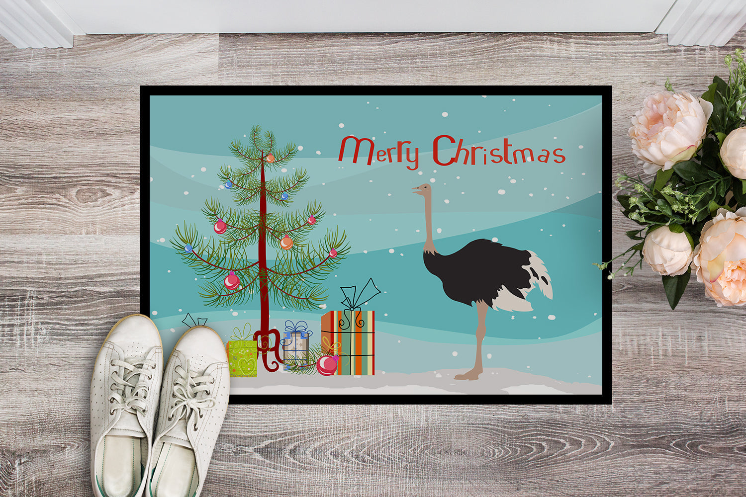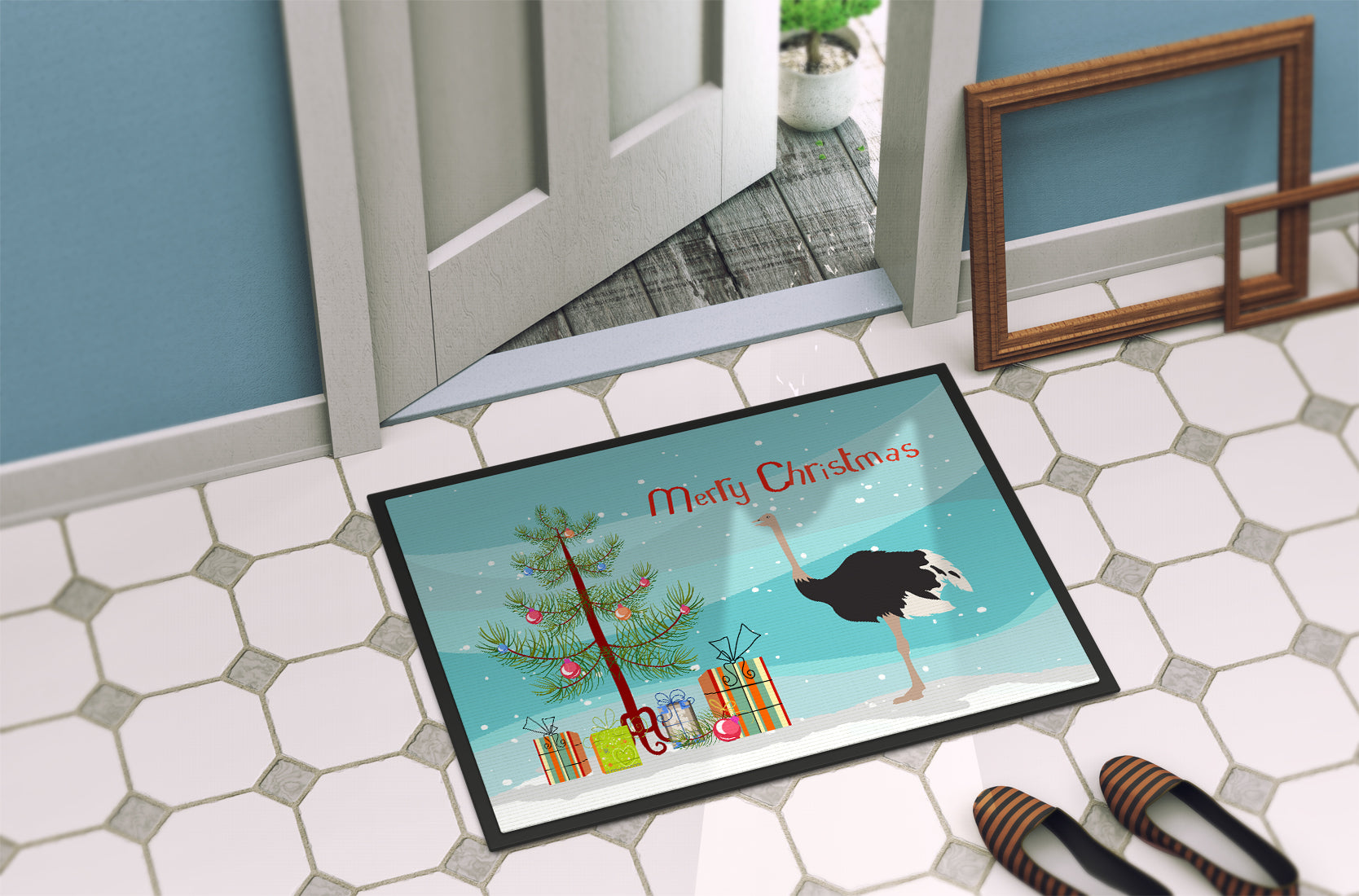 Decorate your space with our Christmas Common Ostrich artwork on a Doormat. Welcome your guests in style with our Artwork Door Mat, designed to withstand almost any weather condition. This mat, measuring approximately 24 by 36 inches, is held together by durable black binding tape. Its top layer, composed of polyester felt, is dyed with the eye-catching image you see on the mat. A few layers below provide the mat with stability, while its rubber bottom is stamped to help prevent slipping and ensures safety. Our mat works wonderfully as both an indoor or outdoor door mat. For cleaning, simply hose it off with water or use a power washer - no need for any cleaner that produces suds. Avoid scrubbing with a brush, instead, opt for the vacuum on floor setting. Designed manufactured and printed in the USA, this mat is a perfect addition to your porch, outdoor kitchen, entryway, or any indoor space. Its unique design makes it a charming decorative rug that greets your guests and adds a stylish touch to your home decor.
