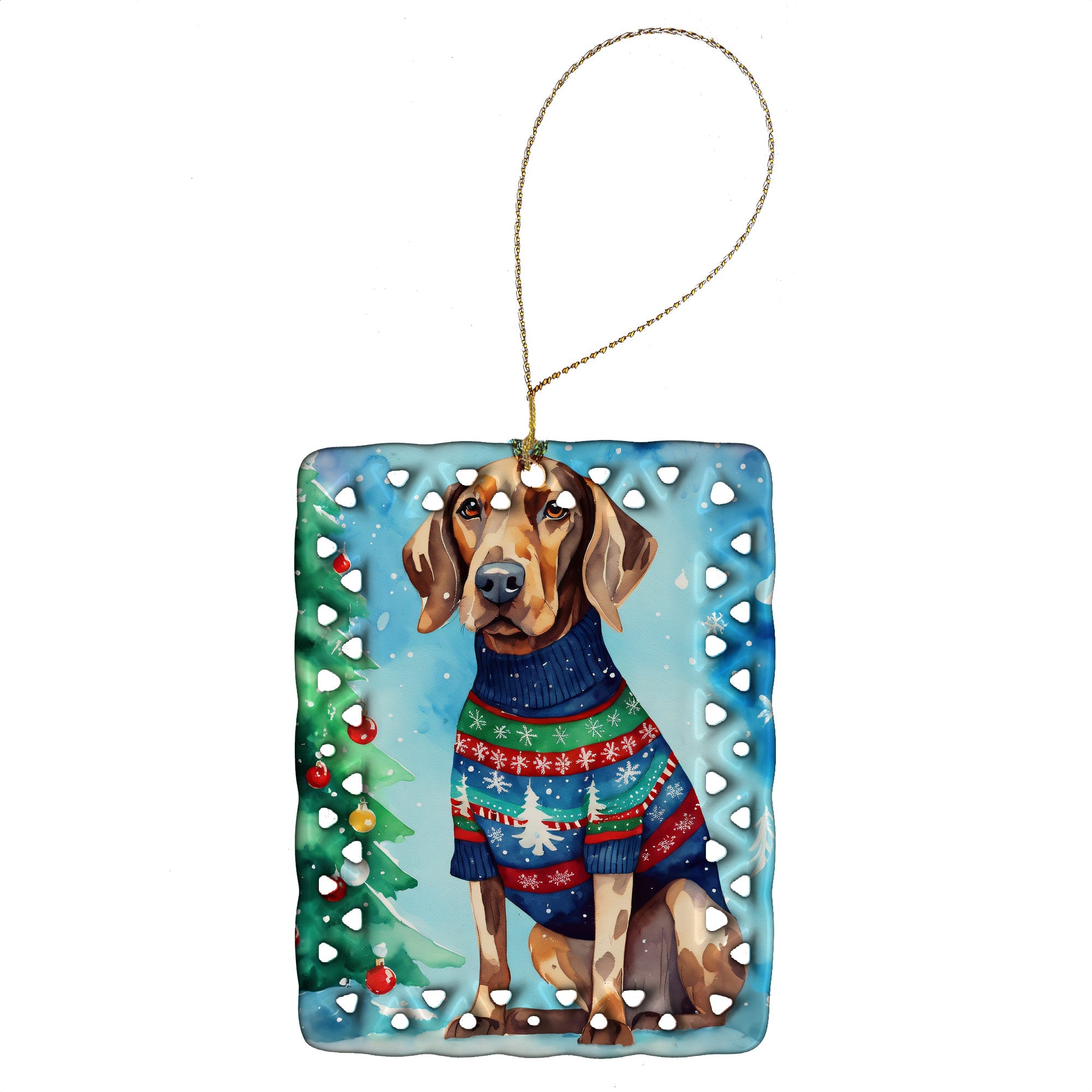 Porcelain Ornament featuring breed specific Coonhound artwork. Celebrate Christmas with this Christmas Ornament. Add a unique, personal touch to your holiday decor with our Rectangular Lattice Porcelain Ornament. Perfect for creating cherished memories, this high-quality ornament shines under festive lights, reflecting warmth and joy throughout your Christmas tree. Crafted with a glossy finish, it showcases vibrant, full-color artwork contributed by our talented artists, ensuring your tree is adorned with a burst of color and holiday spirit. What sets this Porcelain Ornament apart is its customizable white back. Use a paint pen or permanent marker to write a heartfelt message, commemorate a special year, or mark an unforgettable date, turning this ornament into a keepsake that will be treasured for years to come. For best results, allow any personalization to dry thoroughly before handling. Each ornament comes complete with a delicate gold cord, making it easy to hang and display. Proudly made in the USA, this ornament measures 3.375 x 2.625 inches and is a thoughtful gift for pet sitters, teachers, family members, or anyone who would appreciate a little extra holiday magic. Bring style, charm, and a touch of personal meaning to your Christmas tree with this beautifully designed ornament..