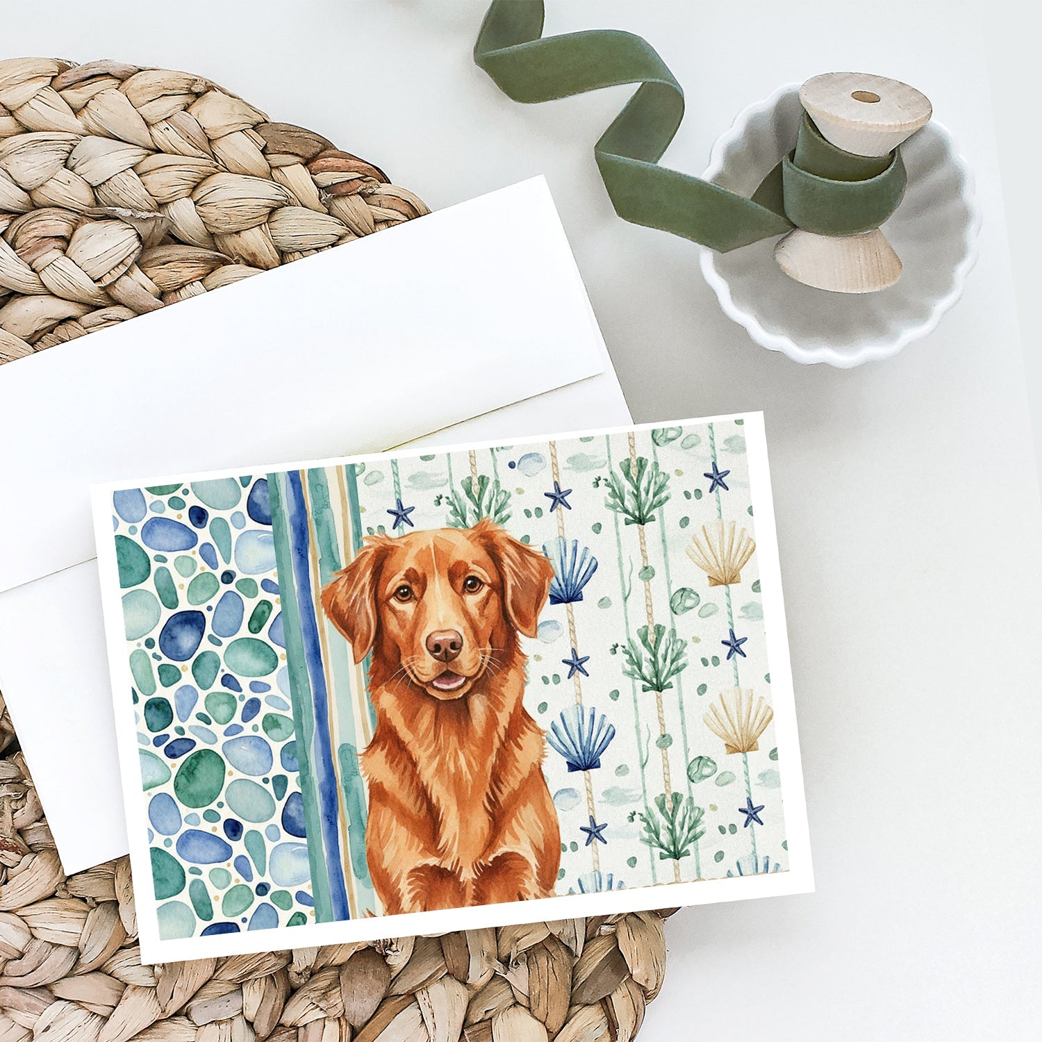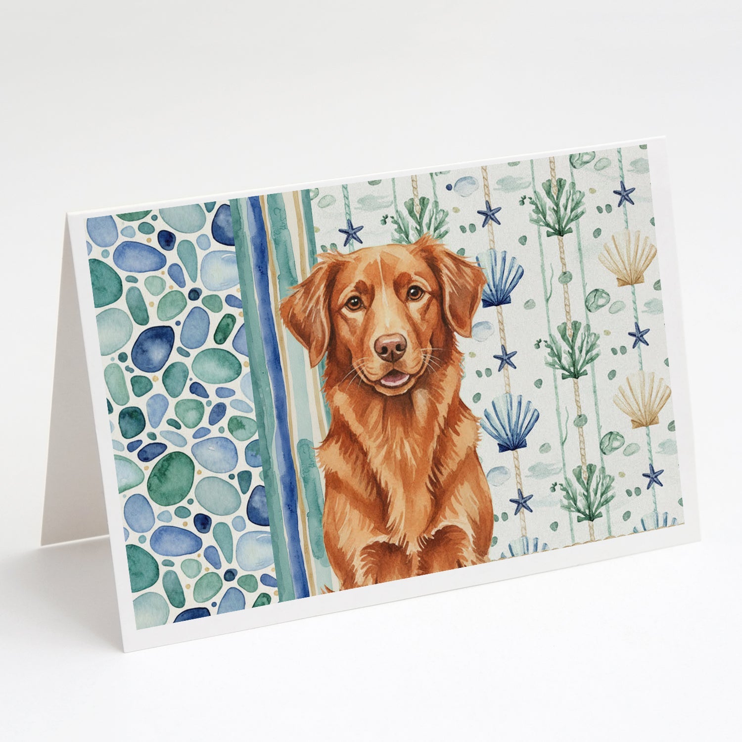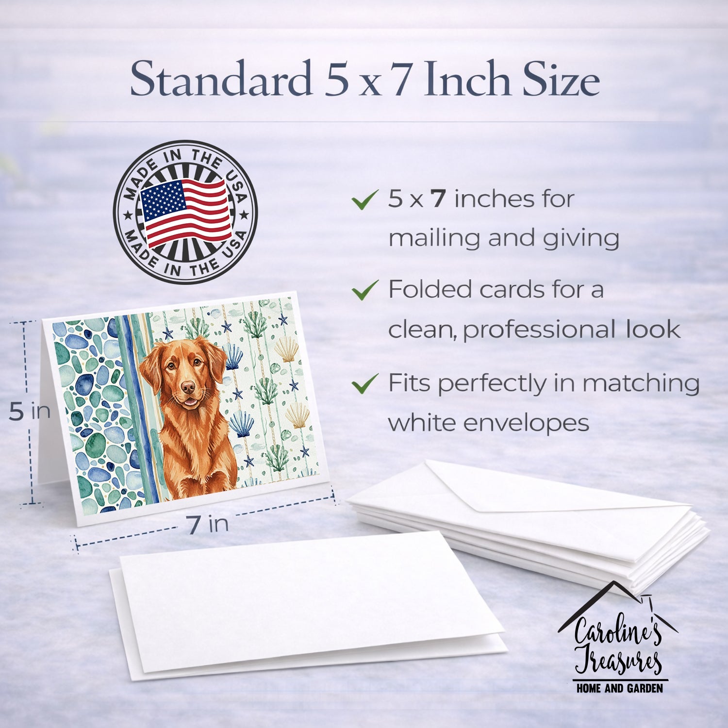 Shown here is the Copper Nova Scotia Duck Tolling Retriever Coastal Sea Glass Greeting Cards Pack of 8 from Caroline's Treasures featuring artwork of a Nova Scotia Duck Tolling Retriever in a Everyday design. The detailed illustration and vibrant colors make it a standout accent that celebrates both seasonal style and love for the subject. This image features a calming coastal watercolor pattern with soft seashells, seaweed, starfish, and pebble-inspired accents arranged in a repeating design. The soothing palette of blues, greens, and sandy neutrals creates a relaxed, beach-inspired look that adds a fresh and tranquil feel to any space. Everyday décor celebrates personal style and the small moments that make a house feel like home. Thoughtful designs add warmth and personality that can be enjoyed year-round. Celebrate special moments with Caroline's Treasures Printed Greeting Card Pack. This pack includes eight beautifully folded 5x7 cards, accompanied by eight matching white envelopes. With blank interiors, these cards provide ample space for your personalized messages and heartfelt holiday greetings. Each card features captivating full-color artwork, meticulously printed in our facility on high-quality 80 lb cover stock or 216 GSM. The super smooth finish of the white cards enhances the visual impact of the artwork, creating a truly stunning presentation. Designed by our talented in-house artists or licensed artists, the artwork on these cards showcases their creativity and attention to detail. From vibrant illustrations to captivating designs, each card tells its own unique story. Whether it's for birthdays, anniversaries, holidays, or any special occasion, Caroline's Treasures Greeting Card Pack is the perfect way to convey your heartfelt sentiments. Share joy, love, and warm wishes with these exquisite cards and make every moment unforgettable. Perfect for: Writing personal messages, everyday correspondence, and thoughtful notes, Dogs-themed stationery collections, or year-round use for Nova Scotia Duck Tolling Retriever lovers. Nova Scotia Duck Tolling Retrievers, often called Tollers, are energetic sporting dogs known for their intelligence and enthusiasm. This retriever breed is admired for its agility, loyalty, and playful drive. Makes a heartfelt gift for: Nova Scotia Duck Tolling Retriever owners, Dogs lovers, Everyday gifts, pet parents, friends who adore their Nova Scotia Duck Tolling Retriever, or anyone celebrating Dogs.