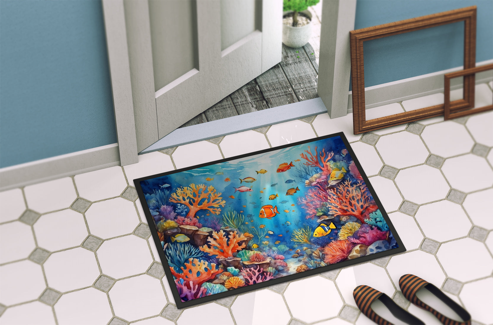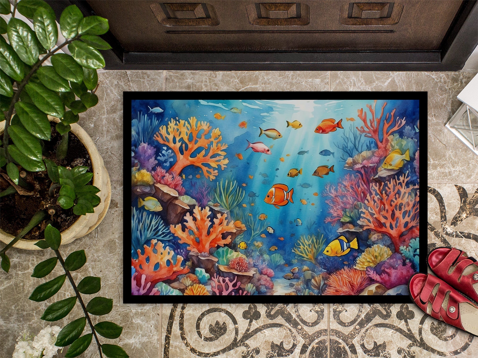 Doormat featuring breed specific Coral artwork. Welcome your guests in style with our Artwork Door Mat, designed to withstand almost any weather condition. This mat, measuring approximately 24 by 36 inches, is held together by durable black binding tape. Its top layer, composed of polyester felt, is dyed with the eye-catching image you see on the mat. A few layers below provide the mat with stability, while its rubber bottom is stamped to help prevent slipping and ensures safety. Our mat works wonderfully as both an indoor or outdoor door mat. For cleaning, simply hose it off with water or use a power washer - no need for any cleaner that produces suds. Avoid scrubbing with a brush, instead, opt for the vacuum on floor setting. Designed manufactured and printed in the USA, this mat is a perfect addition to your porch, outdoor kitchen, entryway, or any indoor space. Its unique design makes it a charming decorative rug that greets your guests and adds a stylish touch to your home decor.