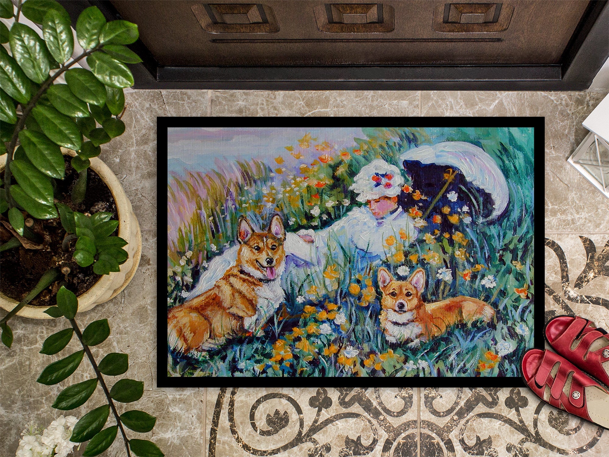 Decorate your space with our Corgi artwork on a Doormat. Welcome your guests in style with our Artwork Door Mat, designed to withstand almost any weather condition. This mat, measuring approximately 18 by 27 inches, is held together by durable black binding tape. Its top layer, composed of polyester felt, is dyed with the eye-catching image you see on the mat. A few layers below provide the mat with stability, while its rubber bottom is stamped to help prevent slipping and ensures safety. Our mat works wonderfully as both an indoor or outdoor door mat. For cleaning, simply hose it off with water or use a power washer - no need for any cleaner that produces suds. Avoid scrubbing with a brush, instead, opt for the vacuum on floor setting. Designed manufactured and printed in the USA, this mat is a perfect addition to your porch, outdoor kitchen, entryway, or any indoor space. Its unique design makes it a charming decorative rug that greets your guests and adds a stylish touch to your home decor.