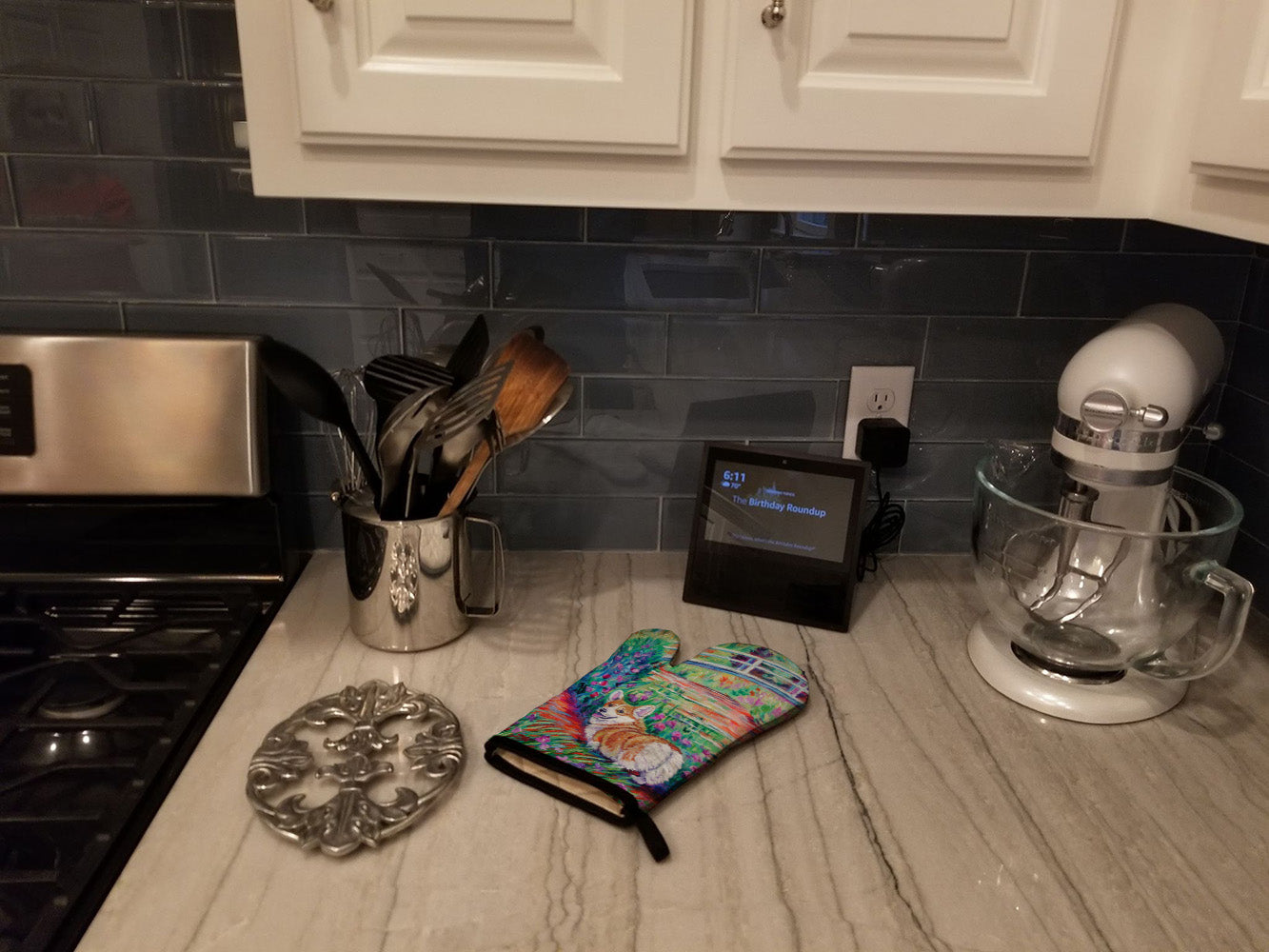 Decorate your space with our Corgi artwork on a Oven Mitt. Presenting our Large Right Hand Thick Heat Resistant Oven Mitt, an indispensable tool for any culinary enthusiast. This mitt boasts layers of quilted protection on both sides, providing outstanding resistance against extreme heat. Embellished with beautifully printed artwork, it adds an extra dash of charm to your kitchen decor. At about 12 inches long and 8 1/2 inches wide, this oven mitt offers a generous fit, accommodating a diverse range of hand sizes. Its design is enhanced by a sleek Black bias tape trim, finished with a convenient hoop for easy hanging. Fresh out of the packaging, the quilting process may give the mitt a stiff feel, but rest assured, it will soften with use and washing. Our mitt is crafted with a unique center fabric, Insul-Bright, a composite material made from polyester fibers, needle-punched through a nonwoven substrate and a reflective metallized film. This smart material resists both conduction and radiant energy, reflecting heat back to its source, all while remaining breathable. Our oven mitt is machine washable and safe for tumble drying. It's a perfect gift for your favorite Chef, BBQ enthusiast, or just a little treat for yourself! Experience safety, style, and convenience rolled into one with this exceptional oven mitt.
