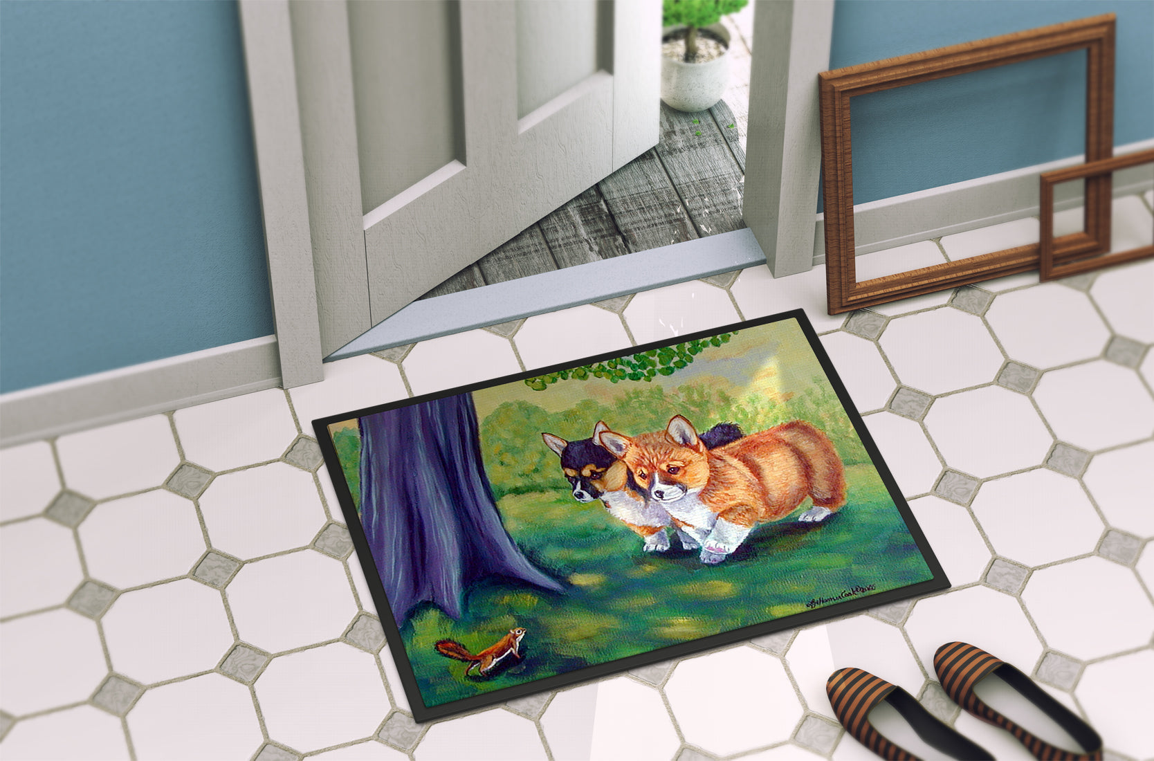 Decorate your space with our Corgi artwork on a Doormat. Welcome your guests in style with our Artwork Door Mat, designed to withstand almost any weather condition. This mat, measuring approximately 18 by 27 inches, is held together by durable black binding tape. Its top layer, composed of polyester felt, is dyed with the eye-catching image you see on the mat. A few layers below provide the mat with stability, while its rubber bottom is stamped to help prevent slipping and ensures safety. Our mat works wonderfully as both an indoor or outdoor door mat. For cleaning, simply hose it off with water or use a power washer - no need for any cleaner that produces suds. Avoid scrubbing with a brush, instead, opt for the vacuum on floor setting. Designed manufactured and printed in the USA, this mat is a perfect addition to your porch, outdoor kitchen, entryway, or any indoor space. Its unique design makes it a charming decorative rug that greets your guests and adds a stylish touch to your home decor.