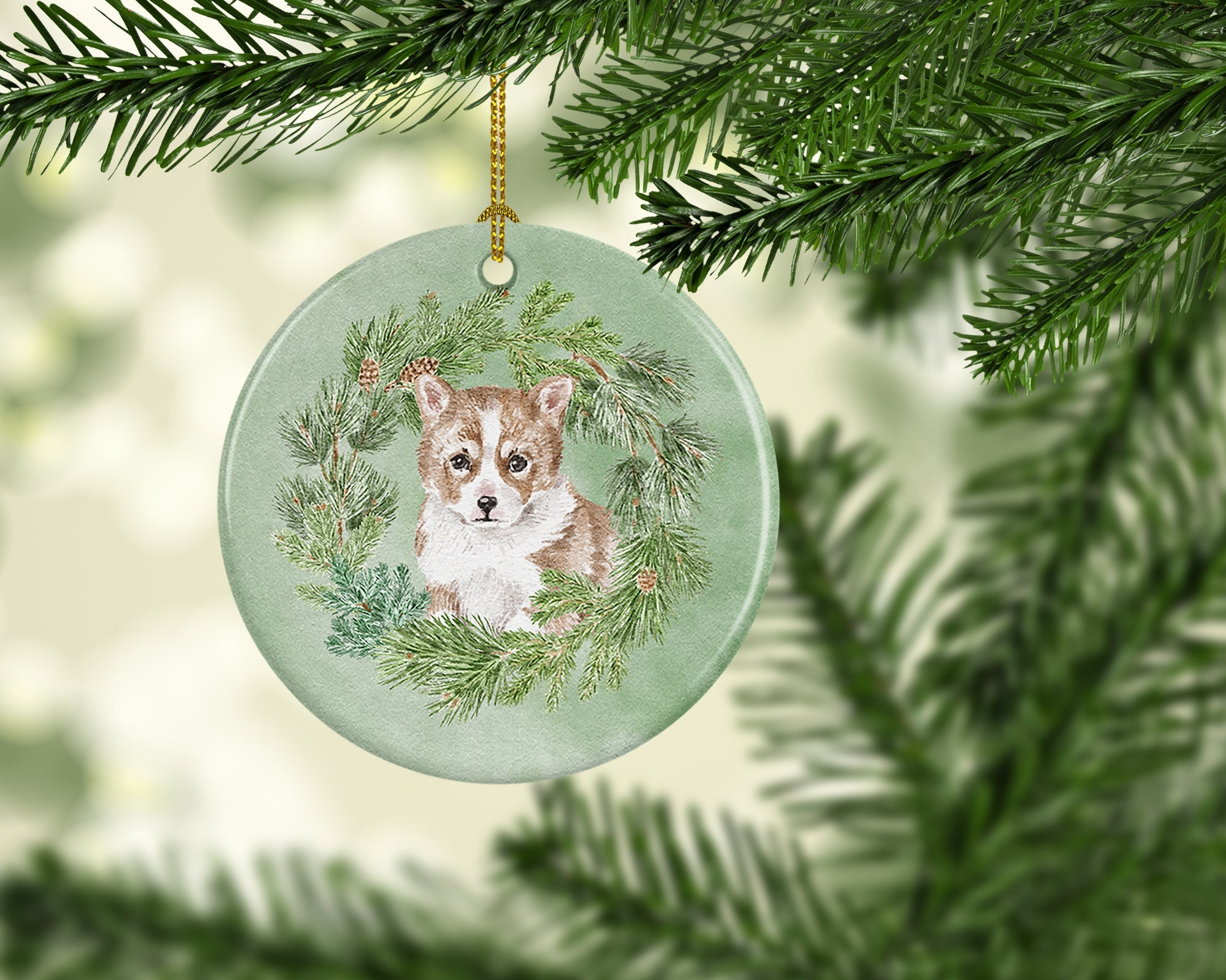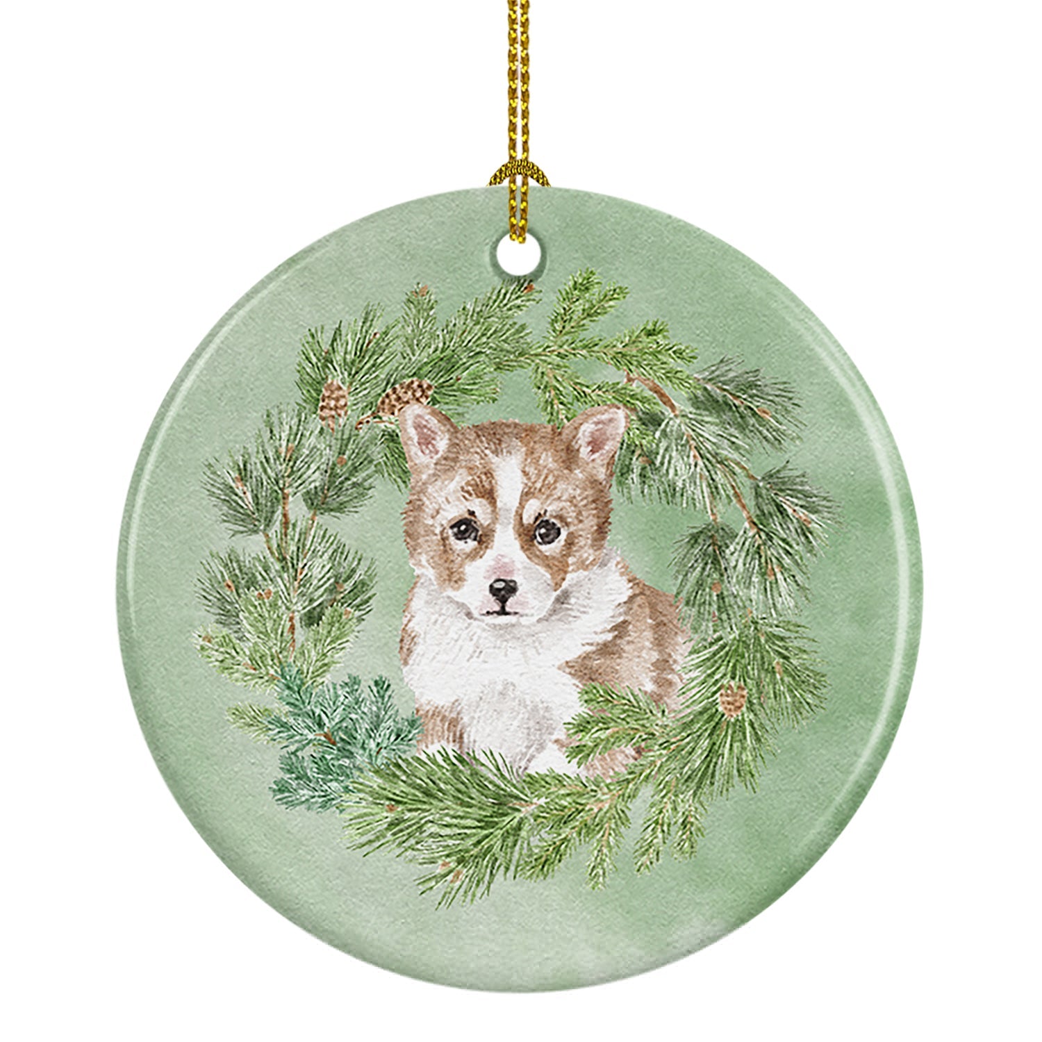 Corgi Puppy Red Christmas Wreath Ceramic Ornament