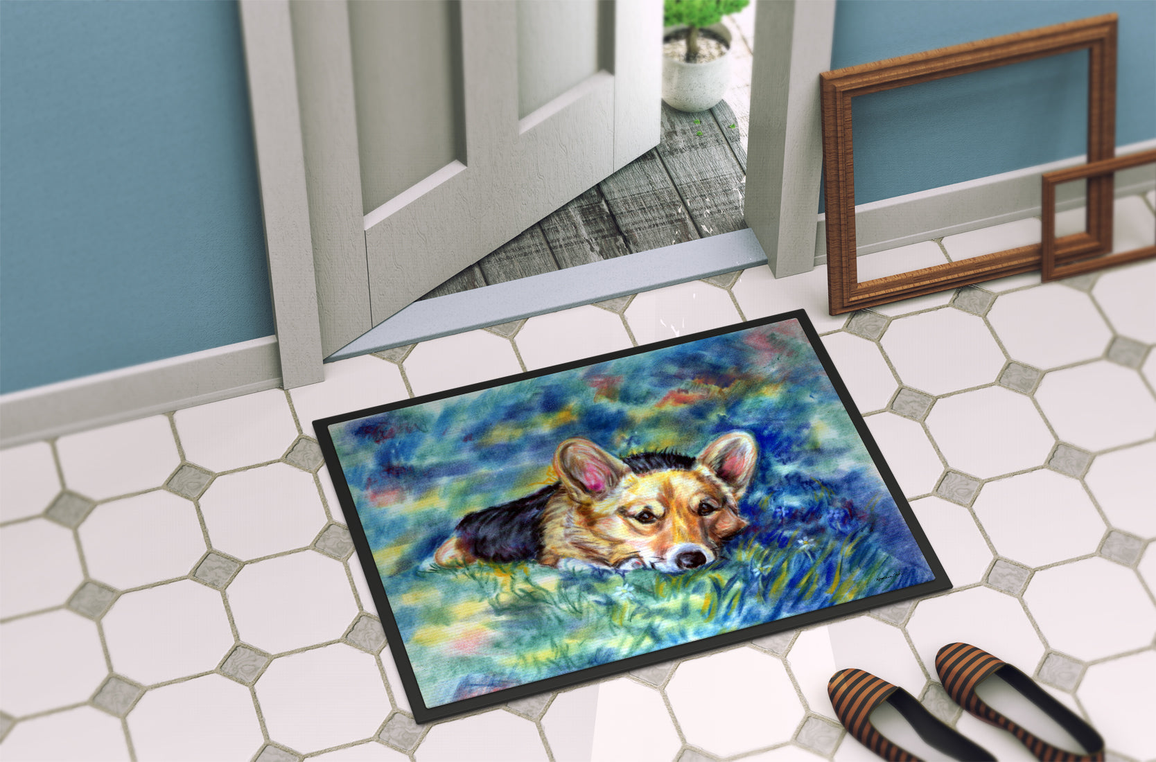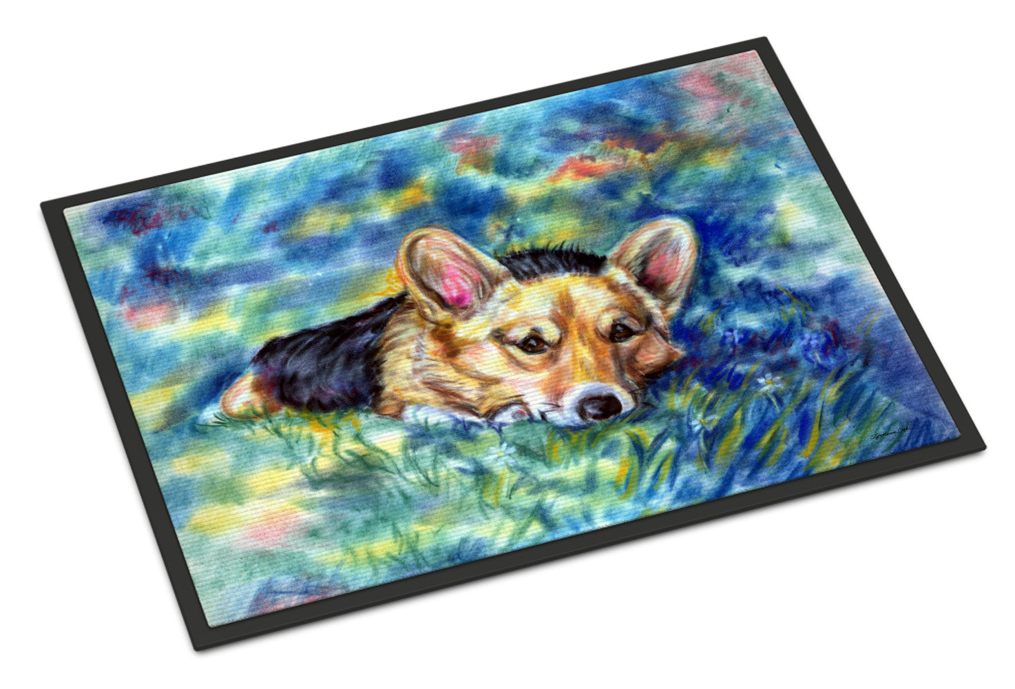 Decorate your space with our Corgi artwork on a Doormat. Welcome your guests in style with our Artwork Door Mat, designed to withstand almost any weather condition. This mat, measuring approximately 18 by 27 inches, is held together by durable black binding tape. Its top layer, composed of polyester felt, is dyed with the eye-catching image you see on the mat. A few layers below provide the mat with stability, while its rubber bottom is stamped to help prevent slipping and ensures safety. Our mat works wonderfully as both an indoor or outdoor door mat. For cleaning, simply hose it off with water or use a power washer - no need for any cleaner that produces suds. Avoid scrubbing with a brush, instead, opt for the vacuum on floor setting. Designed manufactured and printed in the USA, this mat is a perfect addition to your porch, outdoor kitchen, entryway, or any indoor space. Its unique design makes it a charming decorative rug that greets your guests and adds a stylish touch to your home decor.