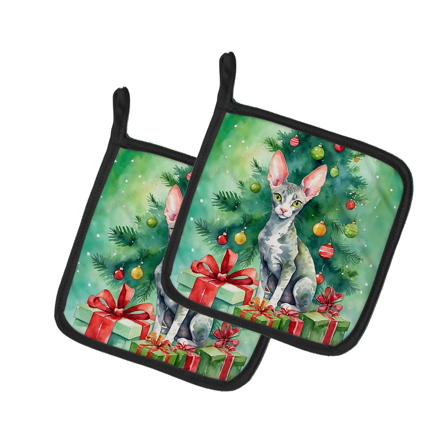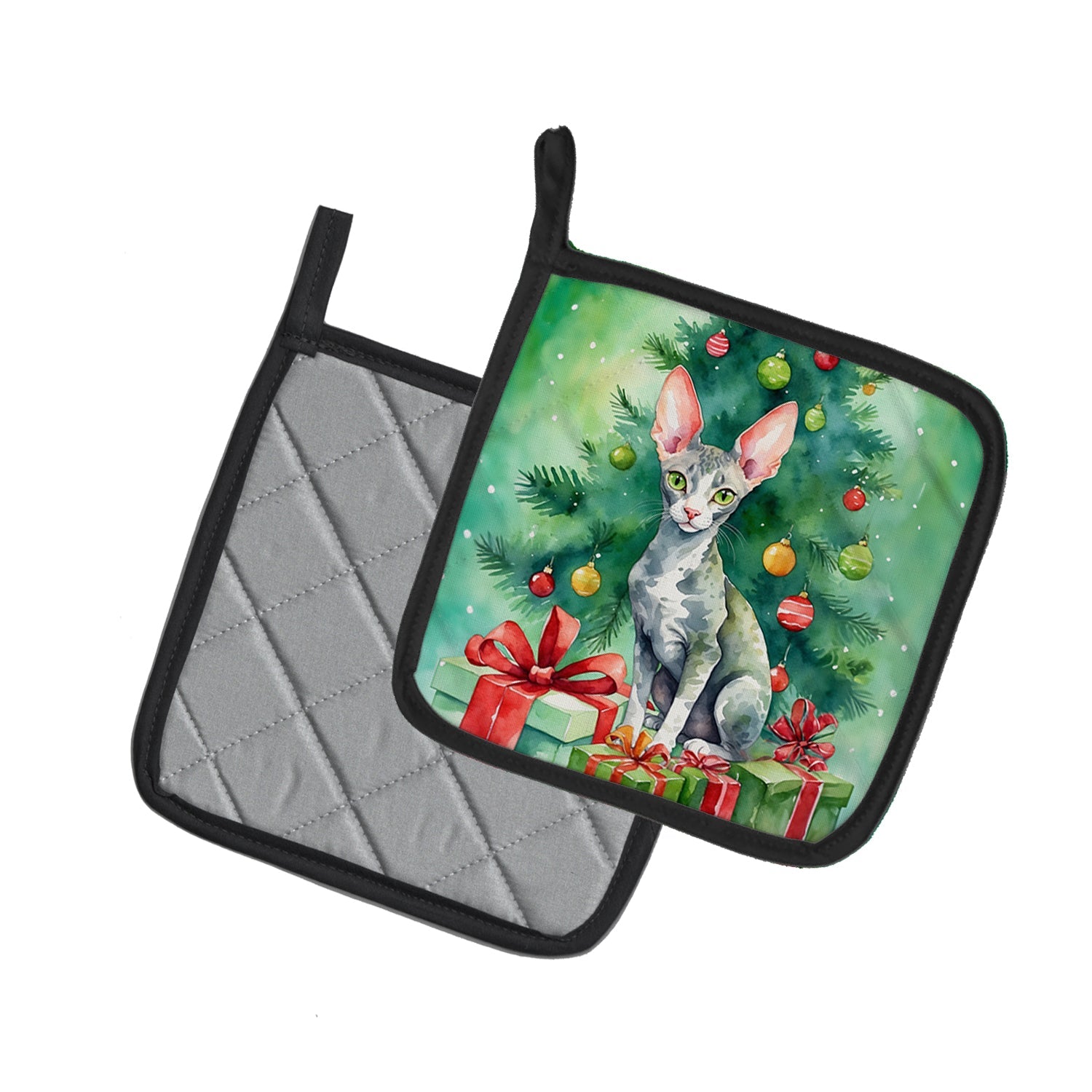 Pair of Pot Holders featuring breed specific Cornish Rex artwork. Celebrate Christmas with this Christmas Pair of Pot Holders. A Pair of Pot Holders to match your kitchen decor. Made in the USA these are thick and functional. Full color artwork decorates the front polyester fabric of the hot pad and accented by a black trim. Use these at as a trivet for your Thanksgiving or Christmas tablescape. Filled with insulated fabric and quilted for durability. These colorful pot holders will make a great gift for your favorite home cook or executive chef. Each pot holder measures approximately 7 1/2 inches by 7 1/2 inches. A hanging tab is included.