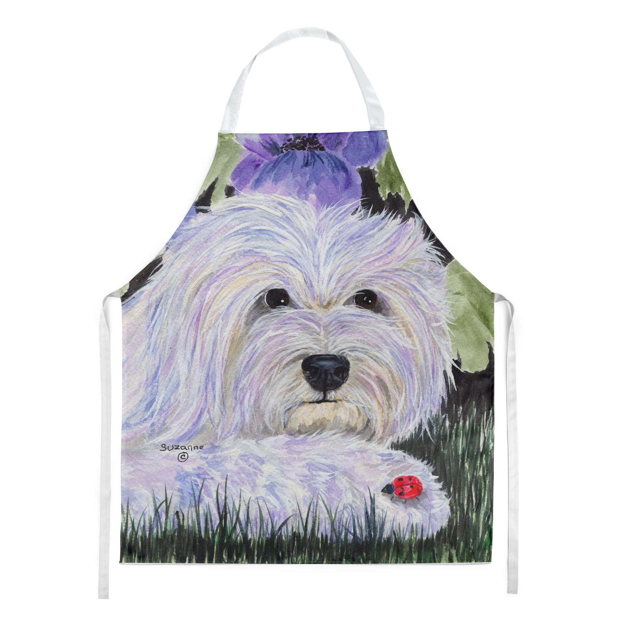 Decorate your space with our Coton de Tulear artwork on a Apron. Elevate your cooking, baking, and grilling experiences with our versatile Kitchen or BBQ Apron. This Bib Style apron isn't just limited to culinary activities - it also serves as an excellent baking apron, artist apron, server apron, gardening apron, or even a dog grooming apron. The apron showcases vibrant full-color artwork contributed by one of our talented artists, bringing a dash of style to your daily tasks. With dimensions of approximately 27"W x 30"H, it provides ample coverage to protect your clothing from spills and splashes. Our apron is meticulously crafted from 100% Ultra Spun Polyester, known for its durability and lightweight nature. The apron comes with white tie straps, ensuring a comfortable and adjustable fit for all. It's a perfect choice for kitchen apron enthusiasts, whether you are a woman or a man. Designed for easy maintenance, this apron is fully machine washable. The quick-drying polyester material actively reduces staining, keeping your apron looking fresh and new for longer. Our beautifully designed apron isn't just a functional kitchen accessory - it's a fashion statement in the culinary world!