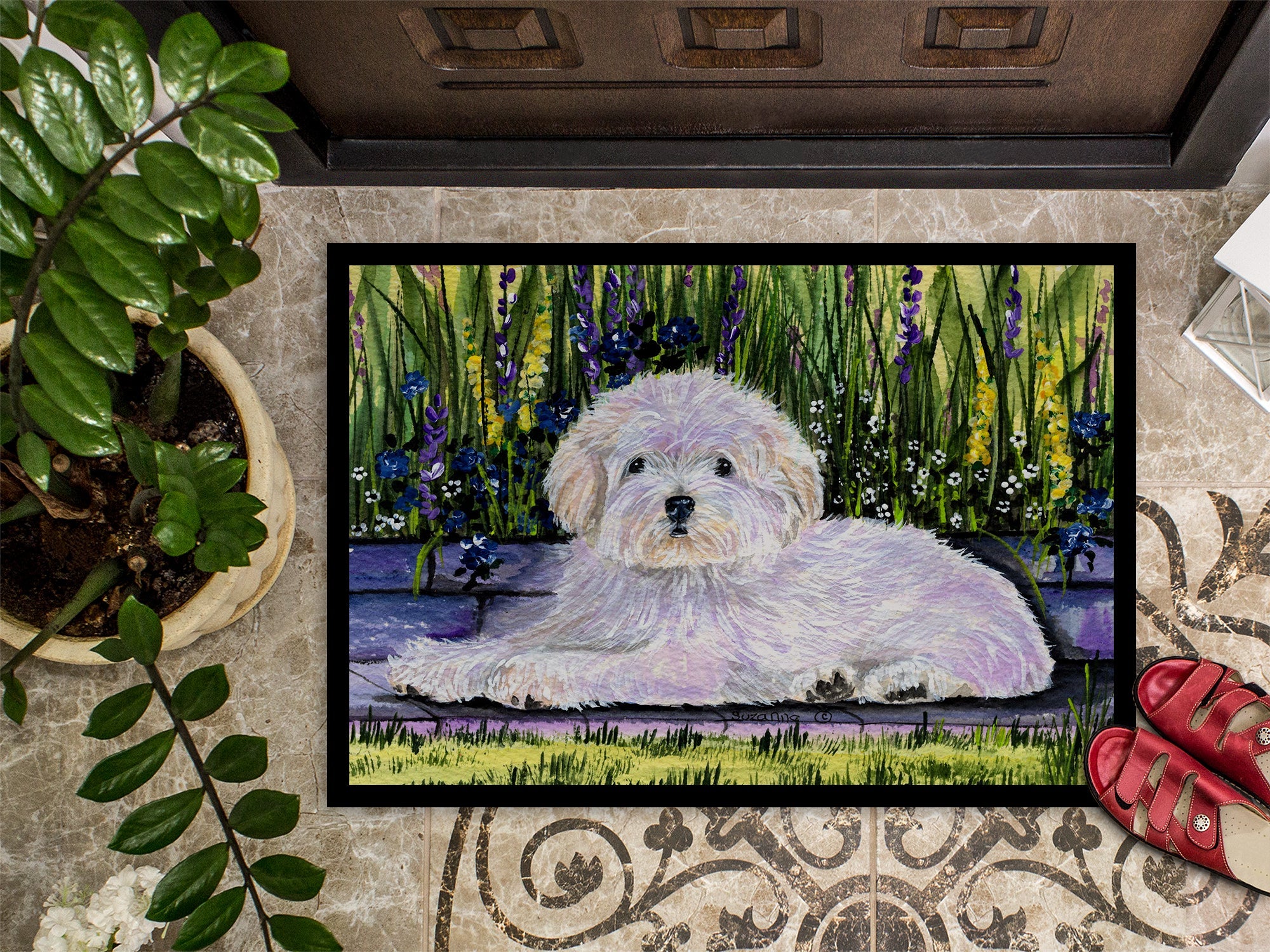 Decorate your space with our Coton de Tulear artwork on a Doormat. Welcome your guests in style with our Artwork Door Mat, designed to withstand almost any weather condition. This mat, measuring approximately 24 by 36 inches, is held together by durable black binding tape. Its top layer, composed of polyester felt, is dyed with the eye-catching image you see on the mat. A few layers below provide the mat with stability, while its rubber bottom is stamped to help prevent slipping and ensures safety. Our mat works wonderfully as both an indoor or outdoor door mat. For cleaning, simply hose it off with water or use a power washer - no need for any cleaner that produces suds. Avoid scrubbing with a brush, instead, opt for the vacuum on floor setting. Designed manufactured and printed in the USA, this mat is a perfect addition to your porch, outdoor kitchen, entryway, or any indoor space. Its unique design makes it a charming decorative rug that greets your guests and adds a stylish touch to your home decor.