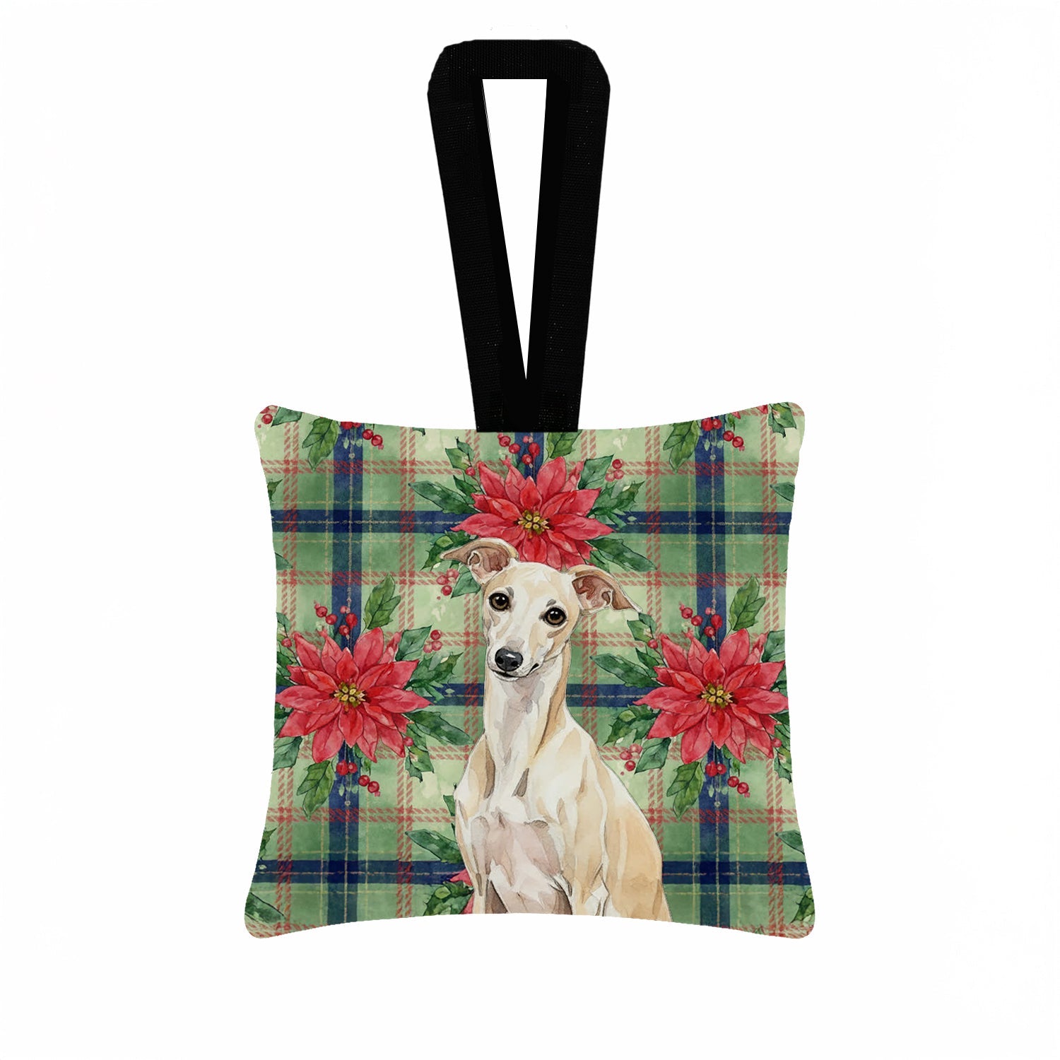 Cream Italian Greyhound Christmas PoinsettIas Hanging Square Fabric Ornament 3.5 x 3.5